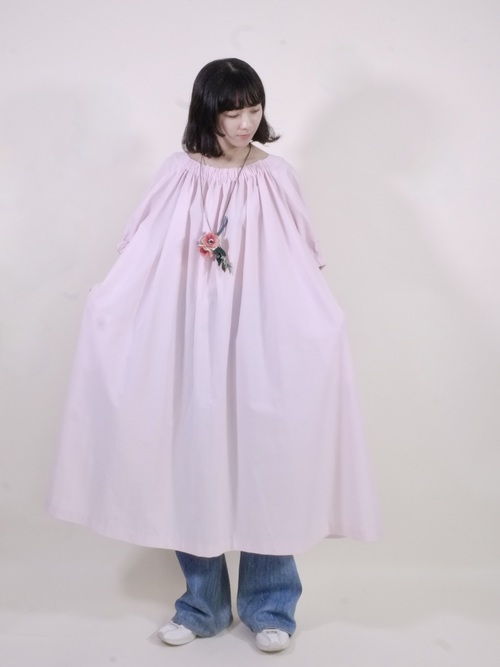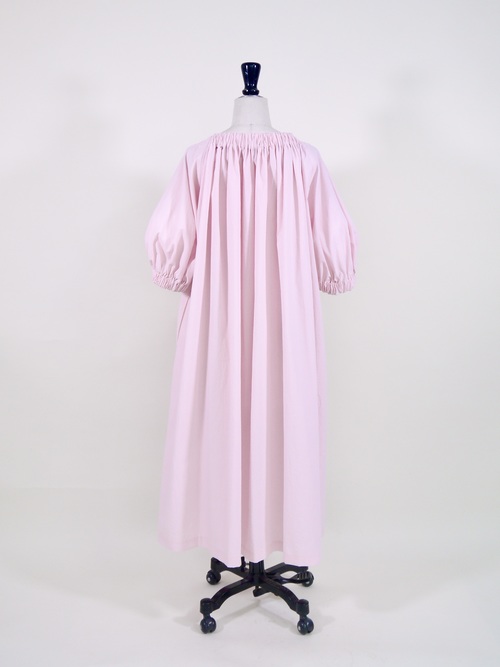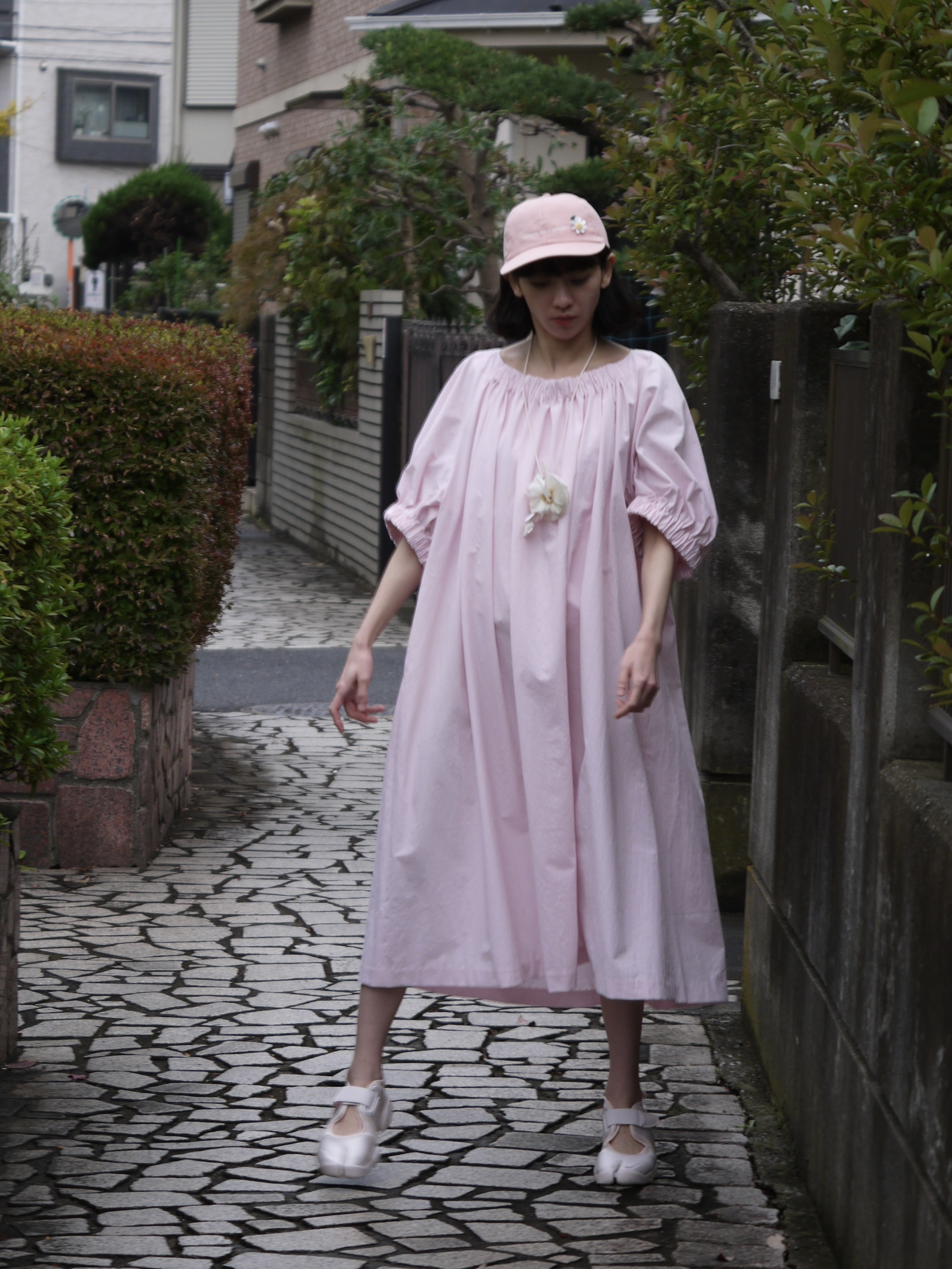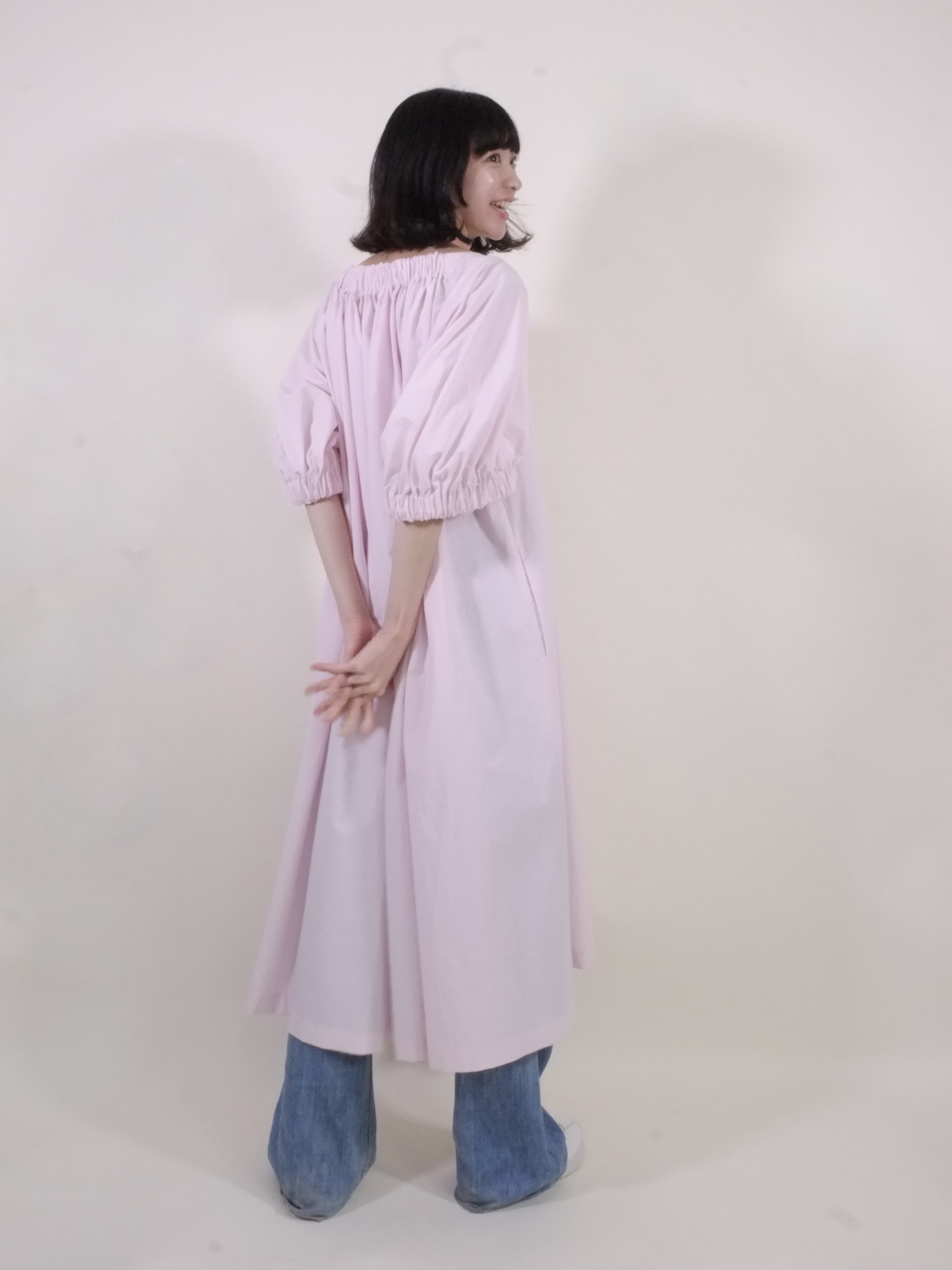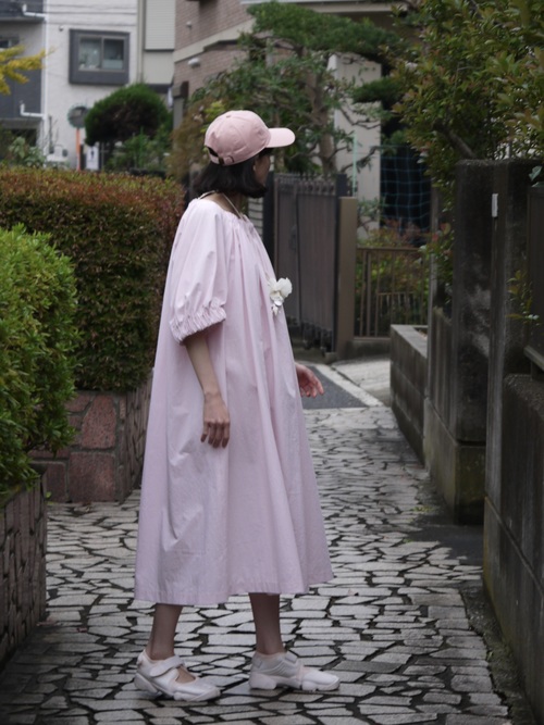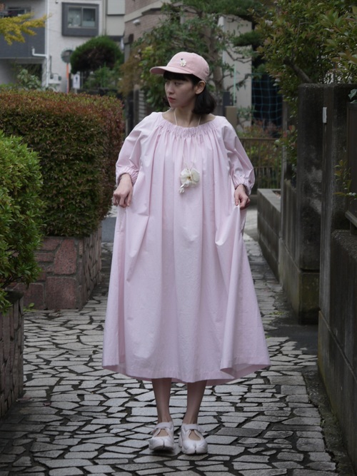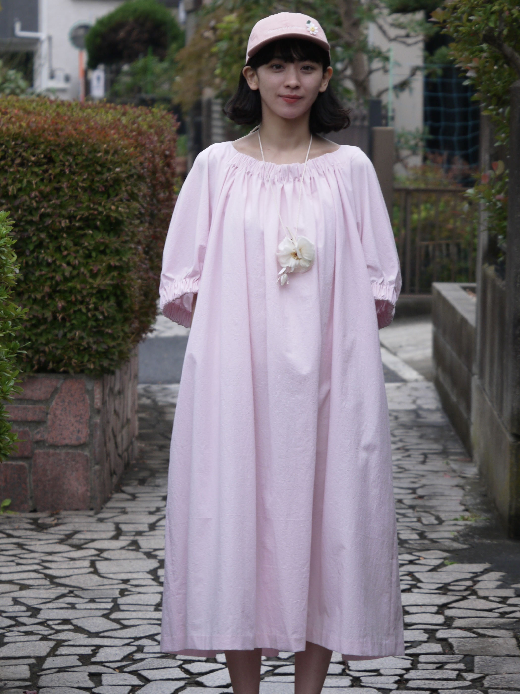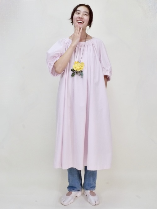 襟ぐりも袖口は広く大きく、裾の分量もあり、風通しのいいドレスです