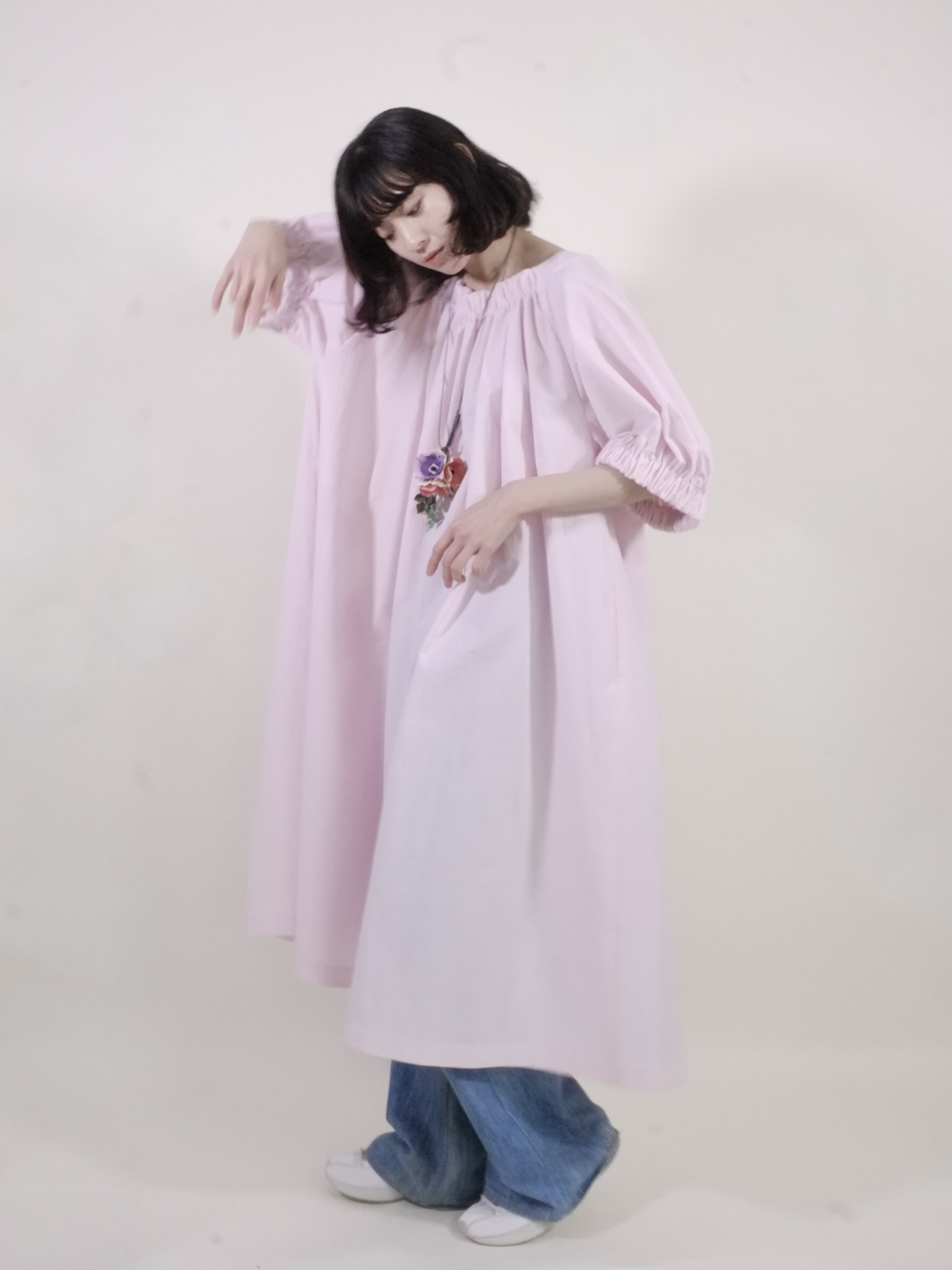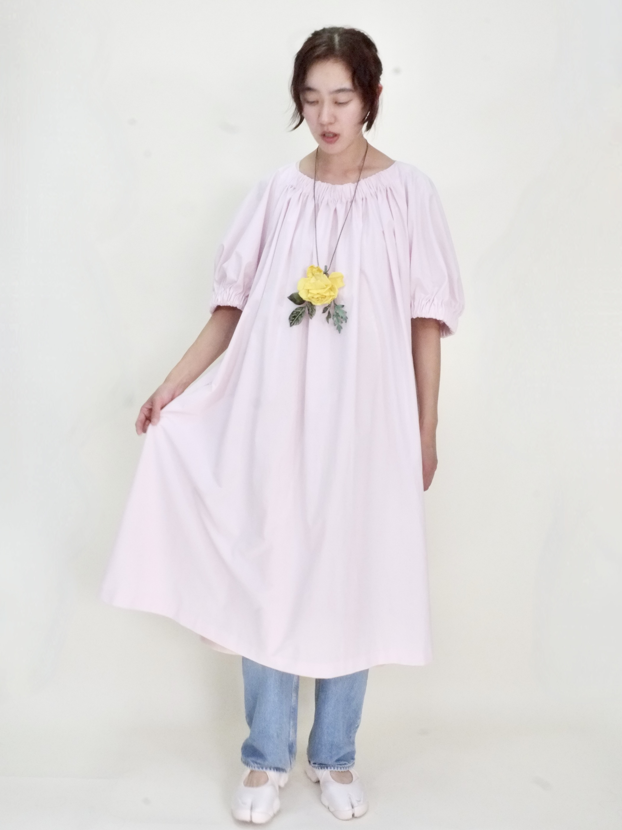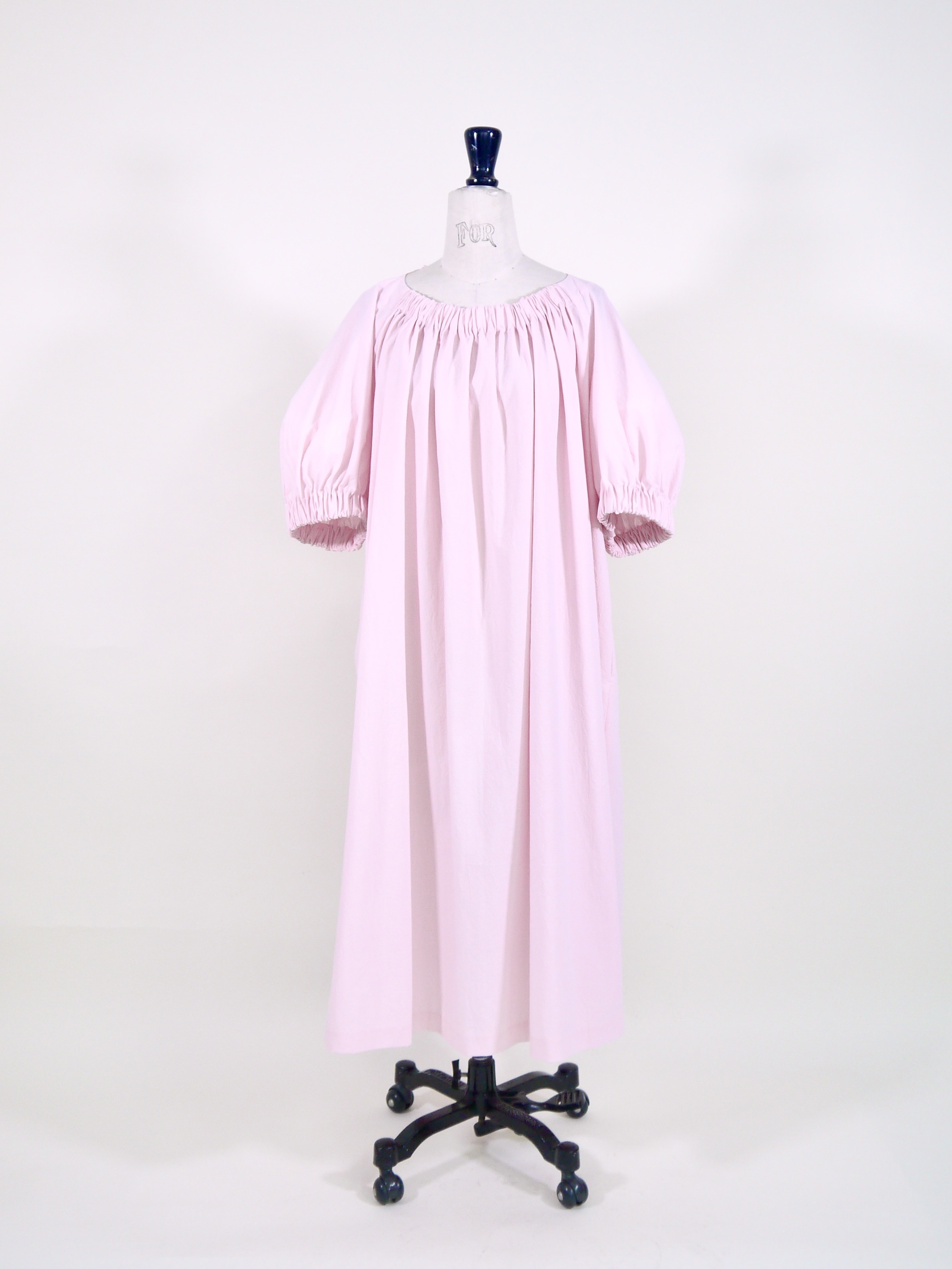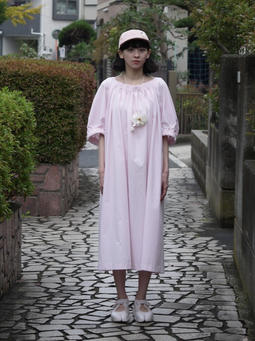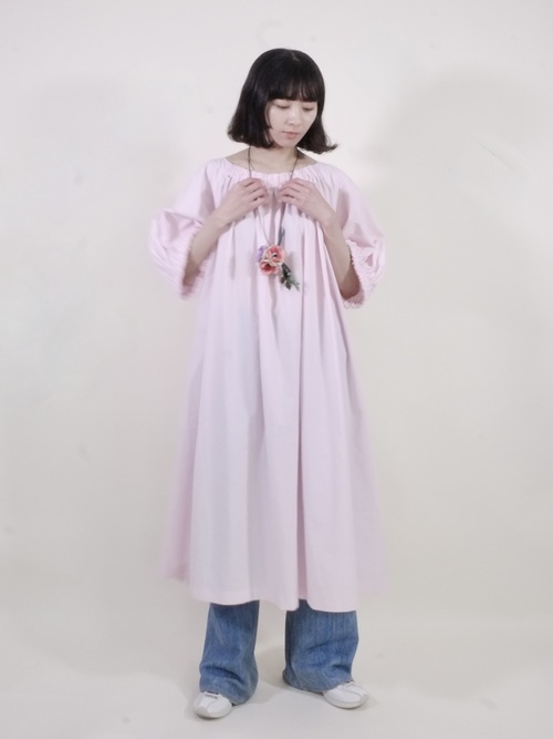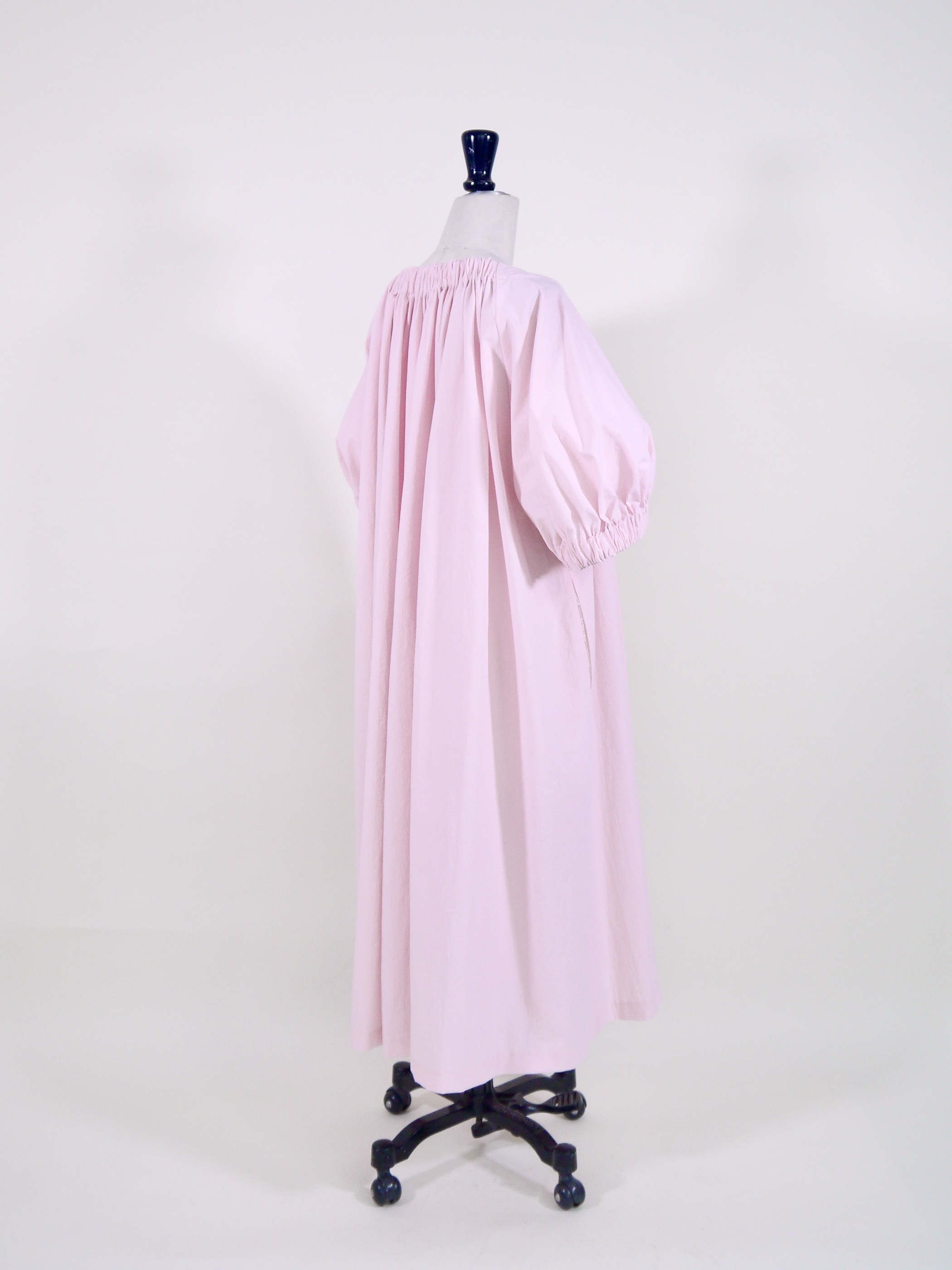 襟ぐりも袖口は広く大きく、裾の分量もあり、風通しのいいドレスです