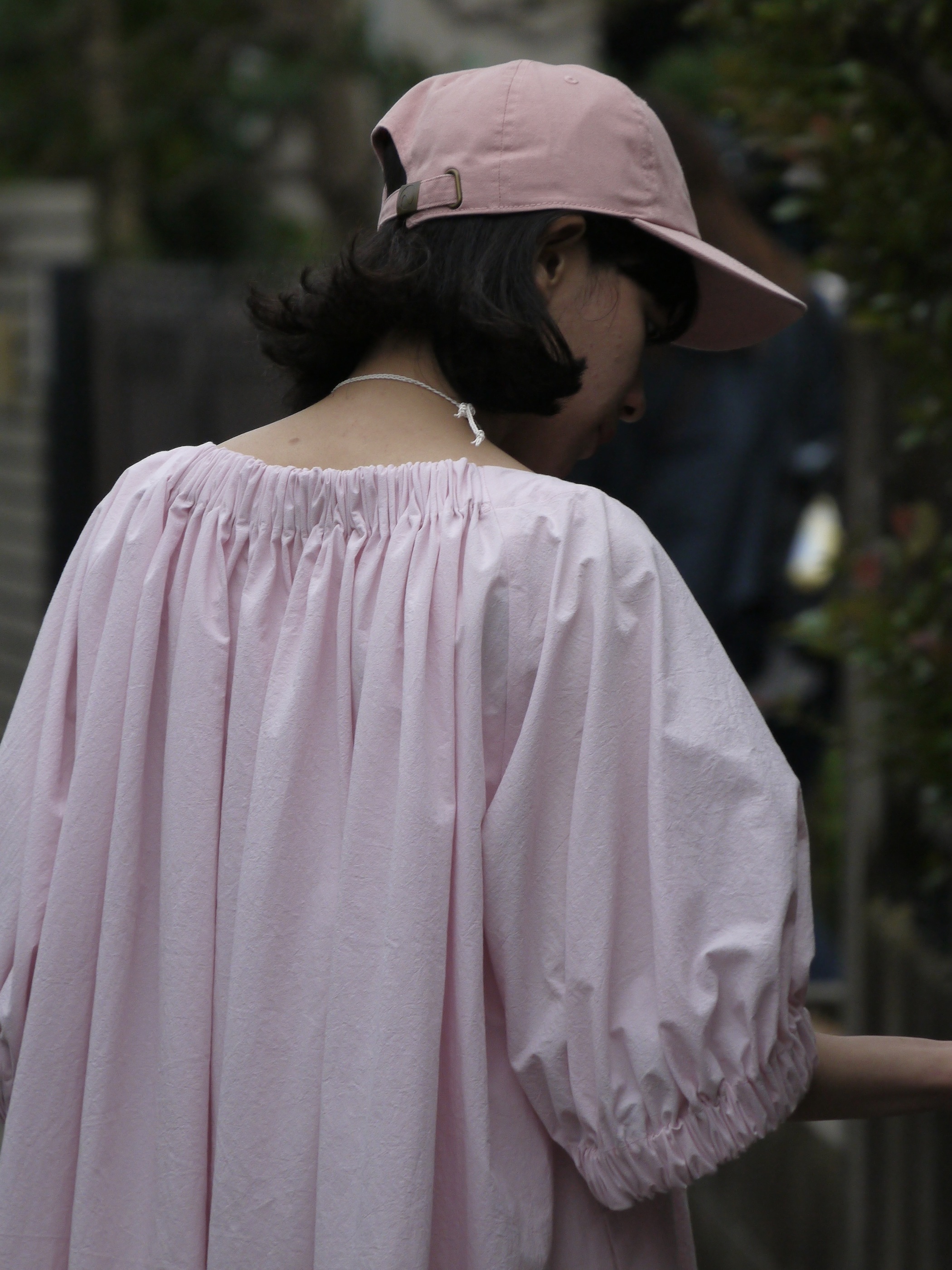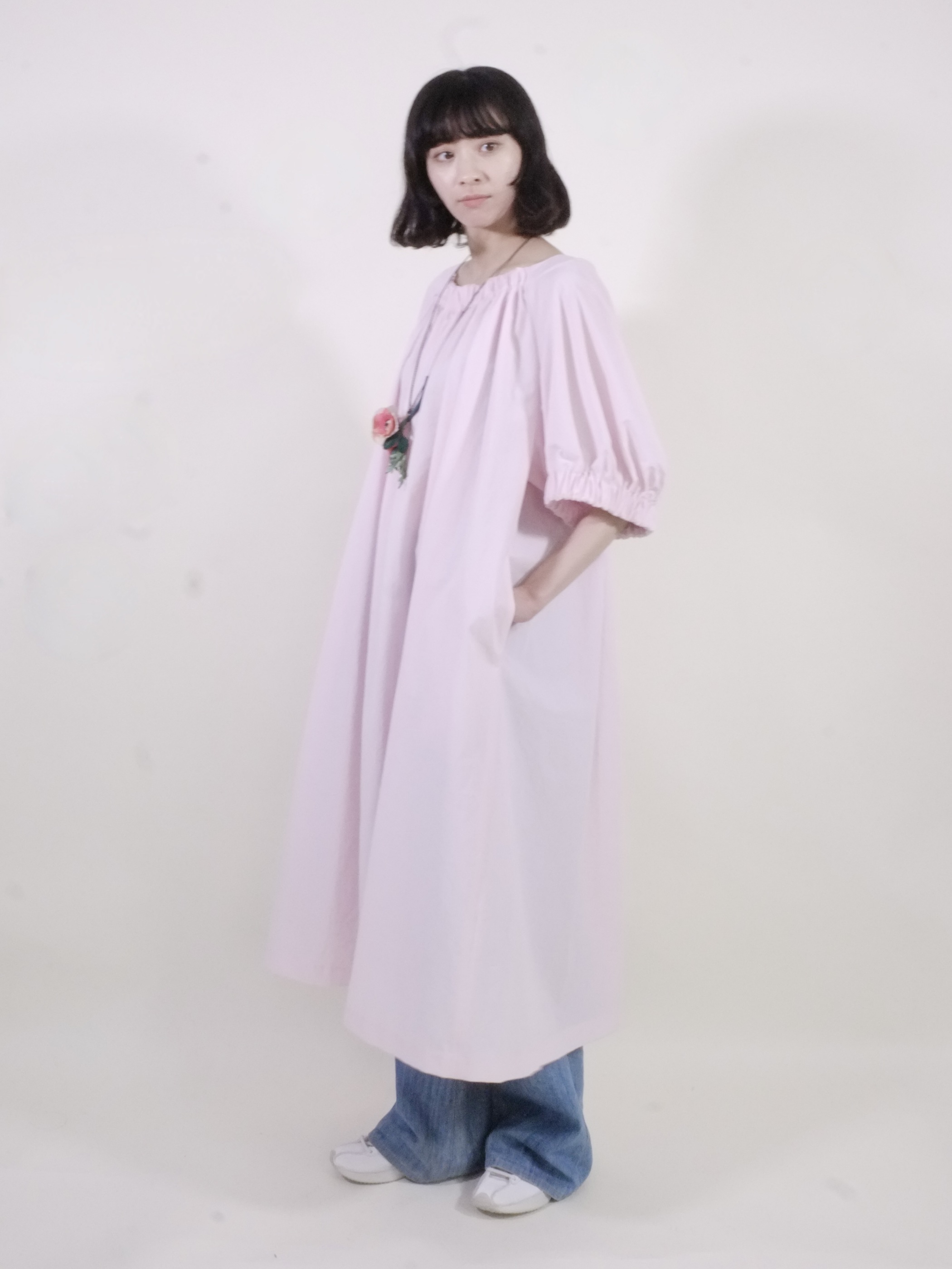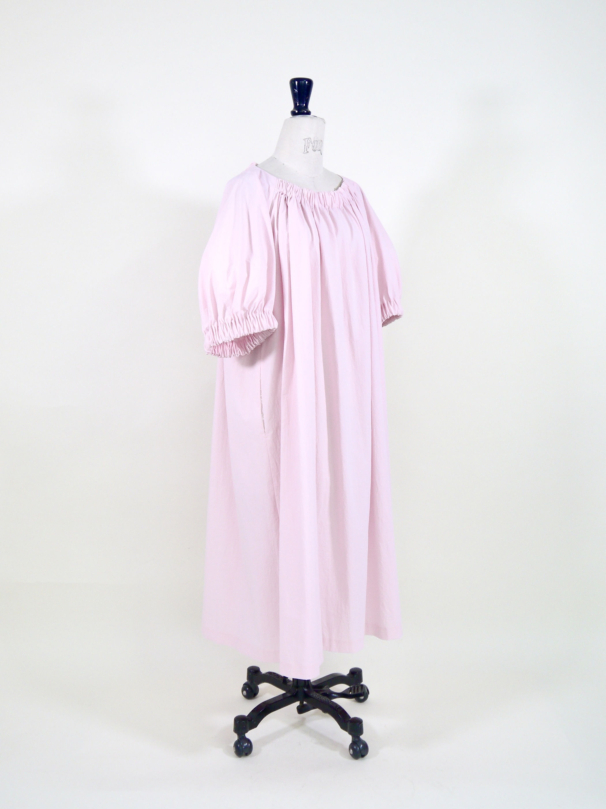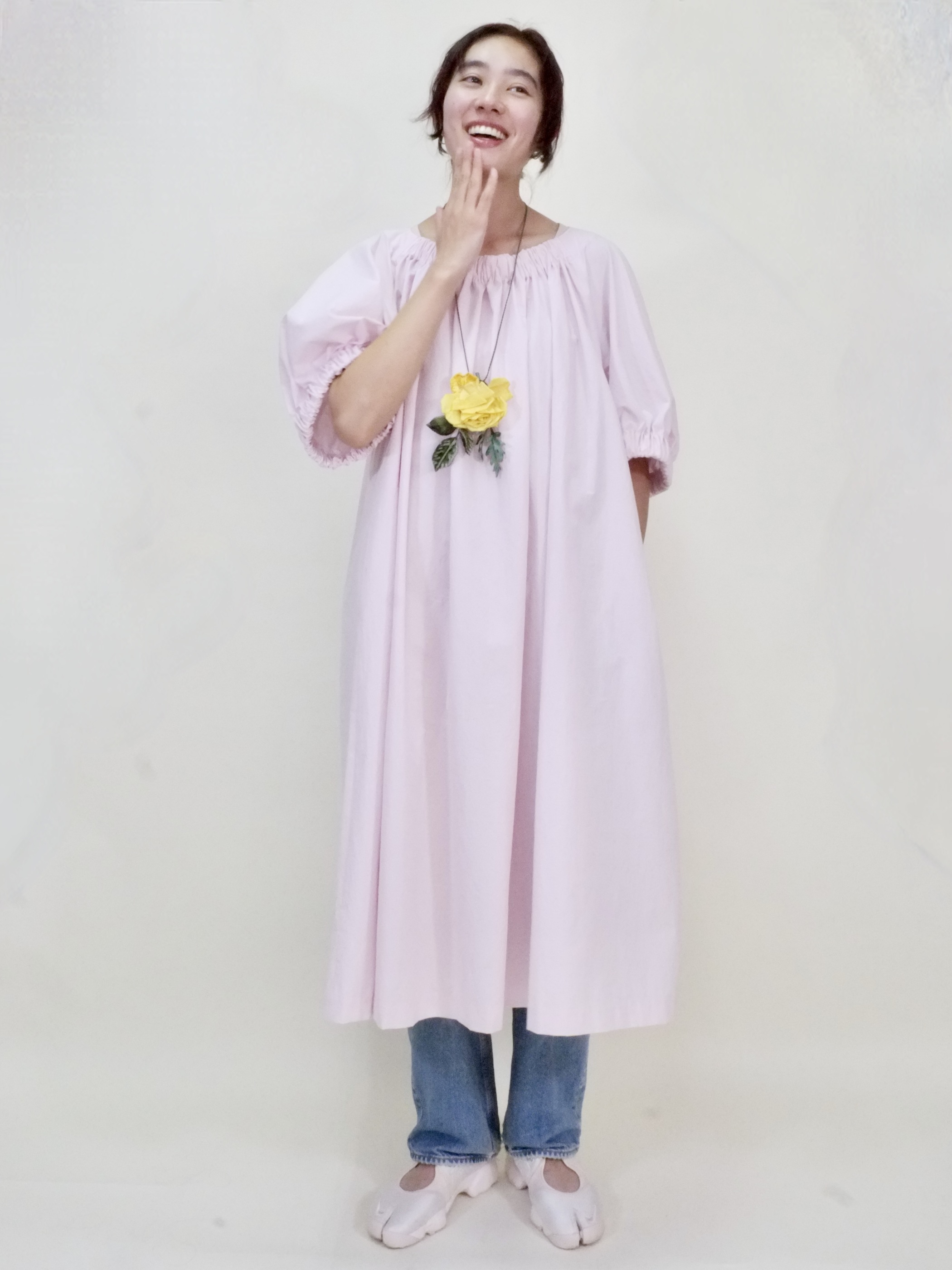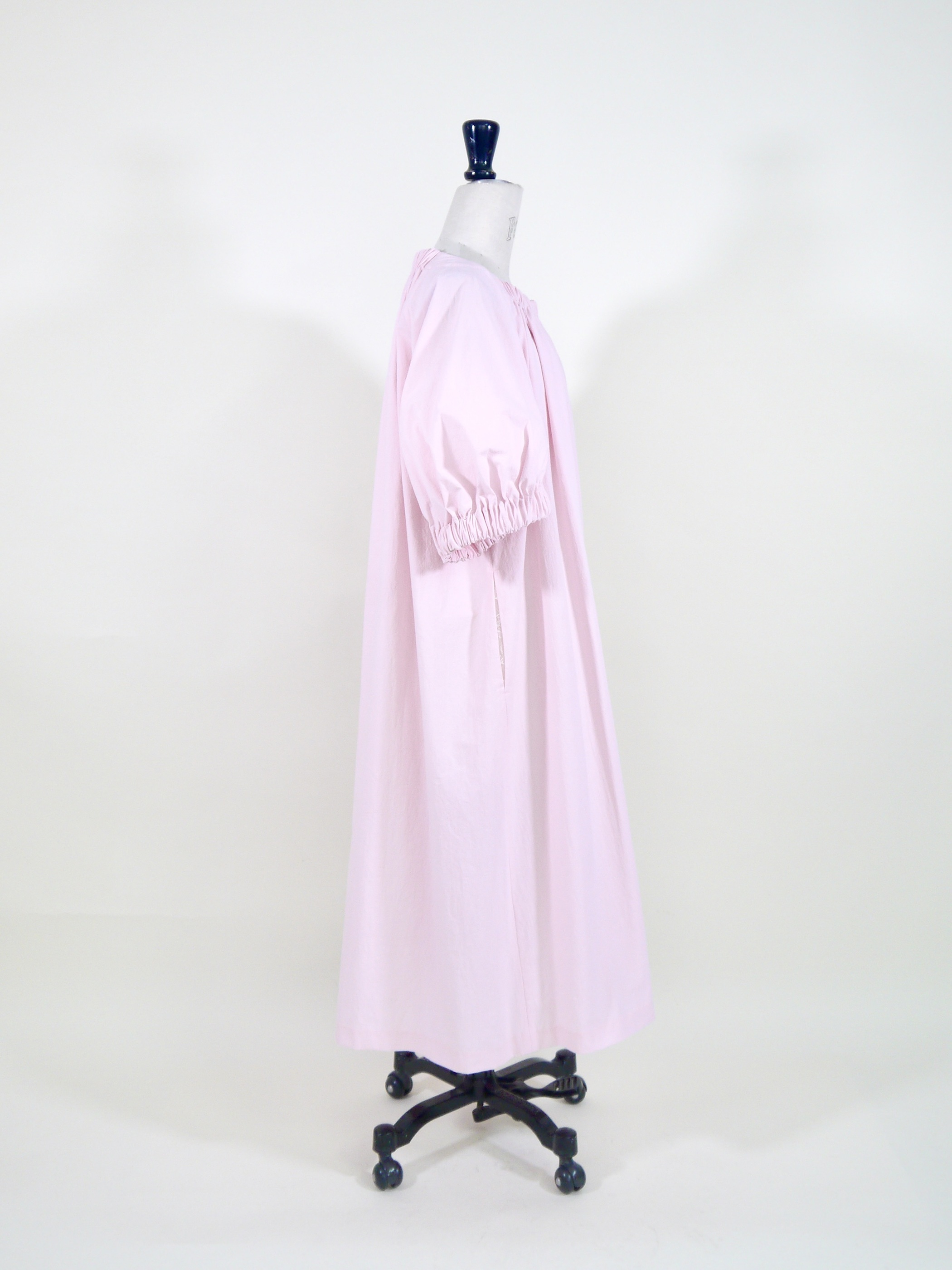 襟ぐりも袖口は広く大きく、裾の分量もあり、風通しのいいドレスです