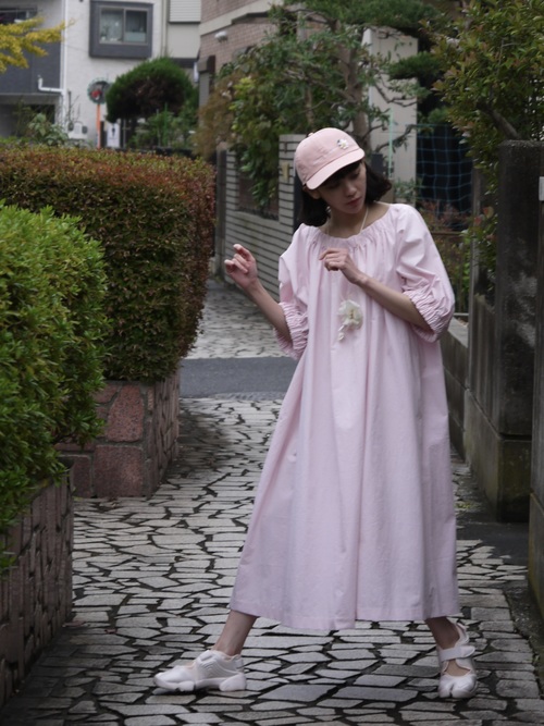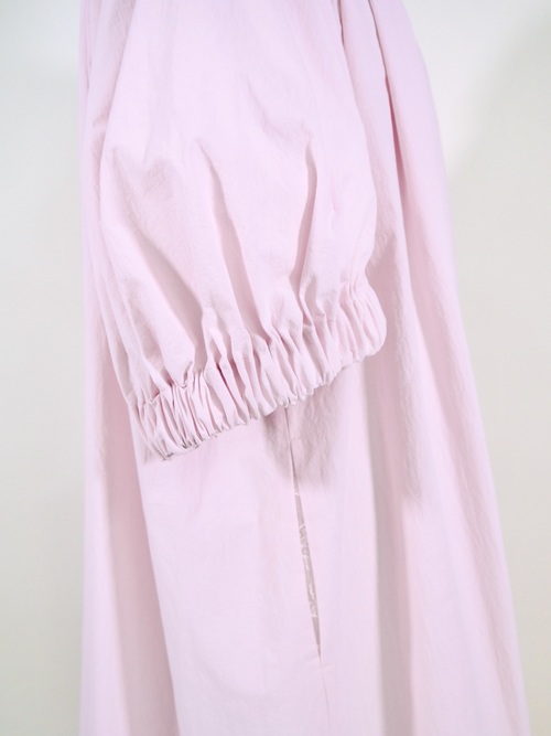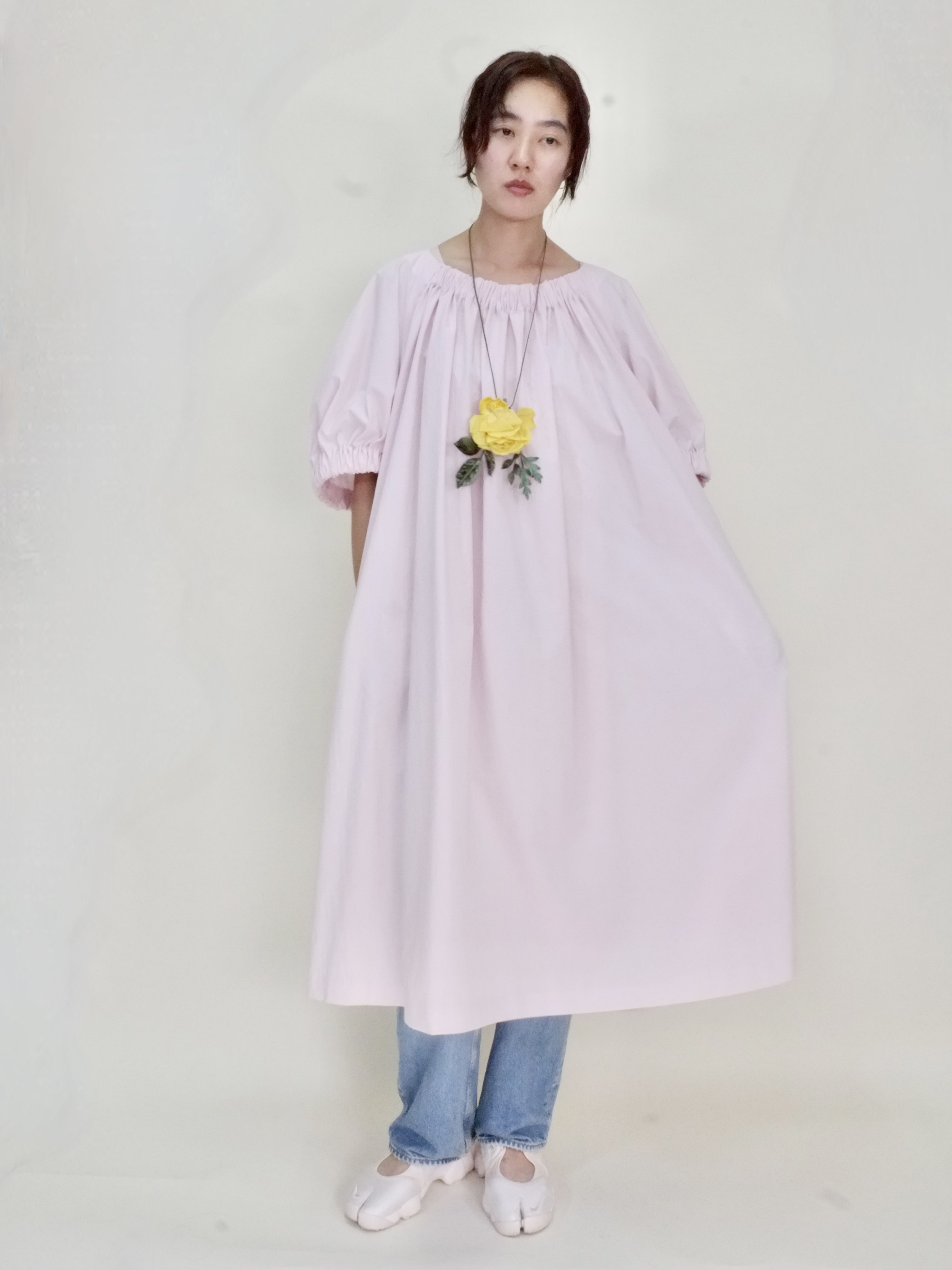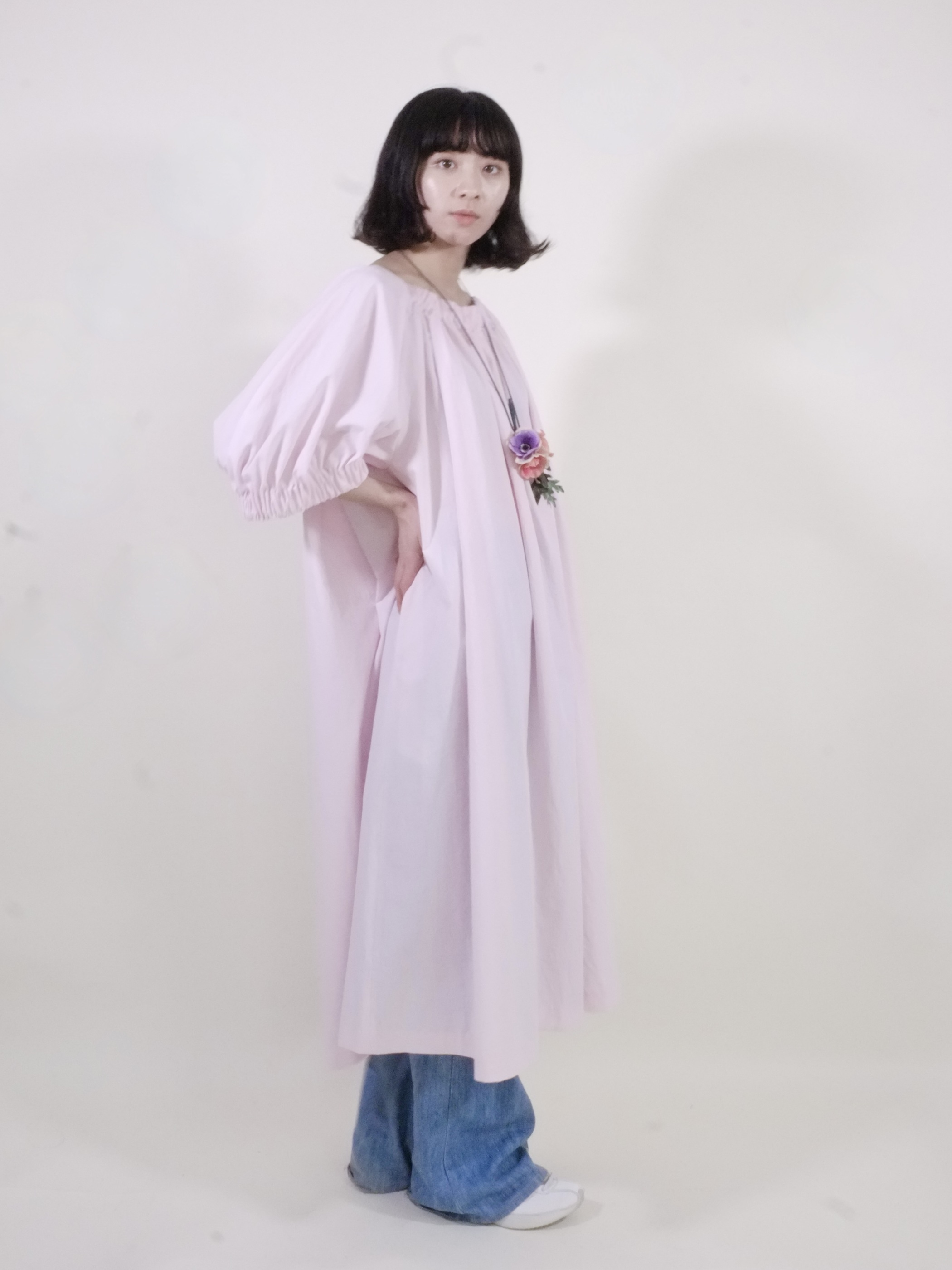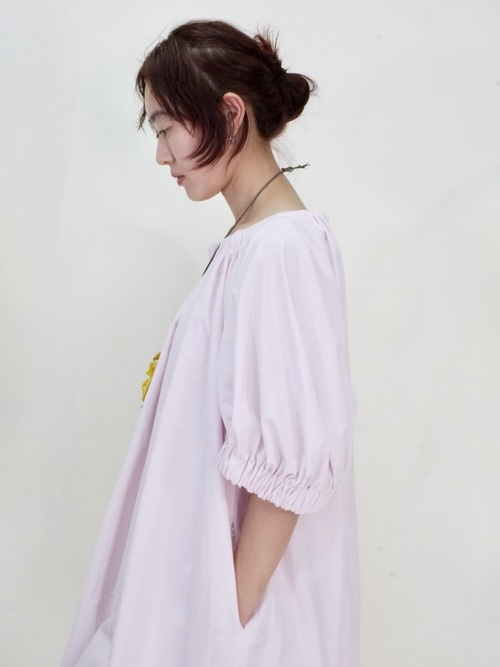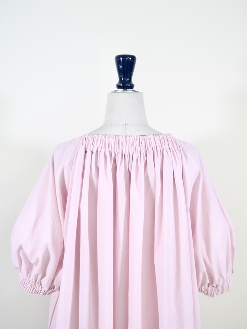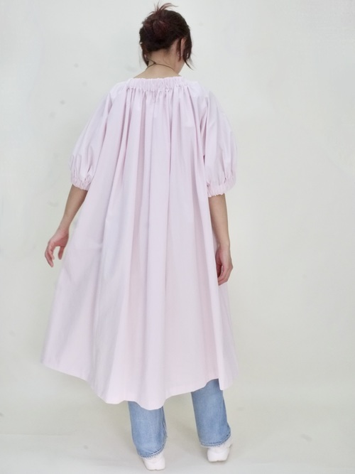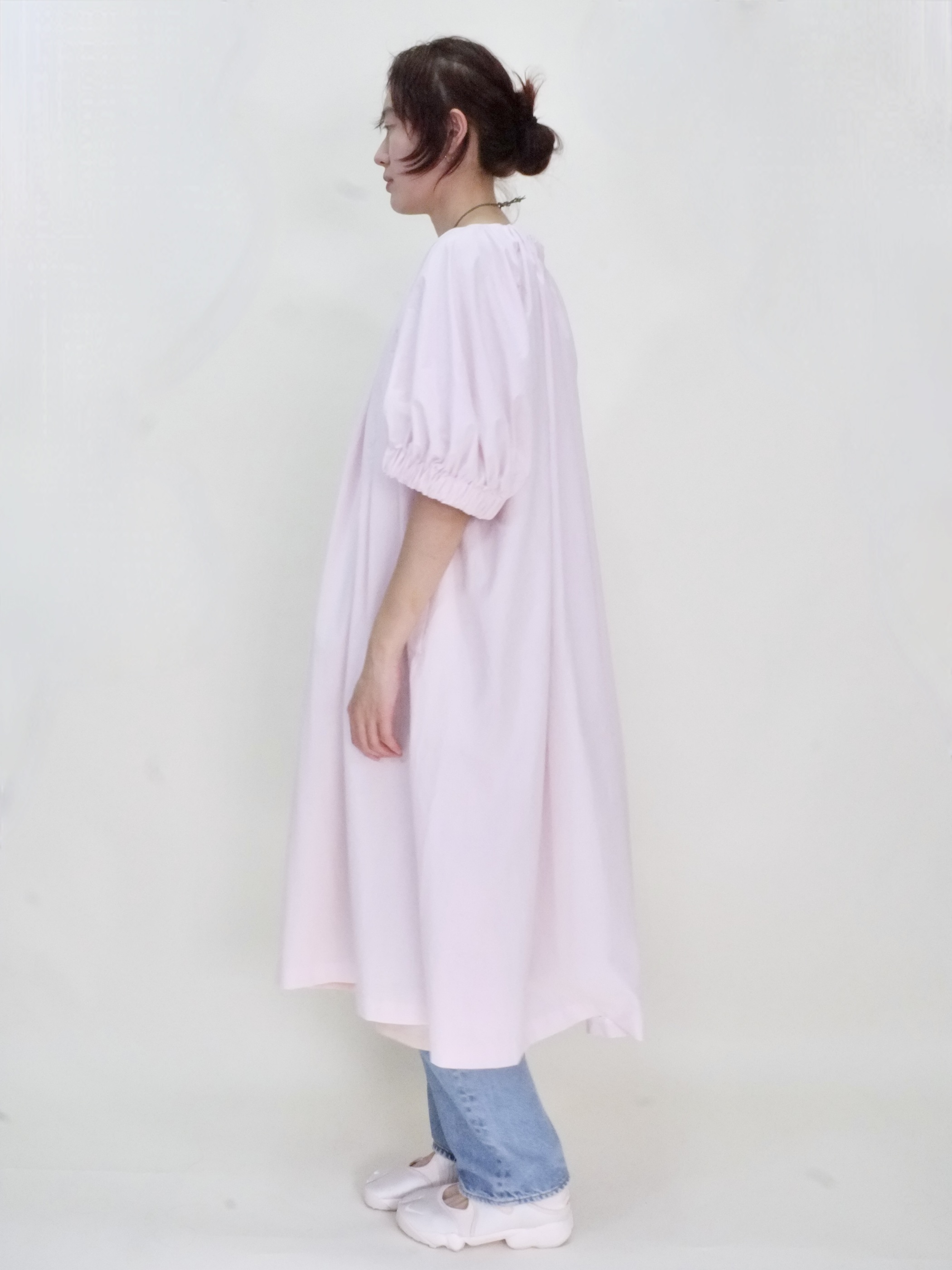 襟ぐりも袖口は広く大きく、裾の分量もあり、風通しのいいドレスです