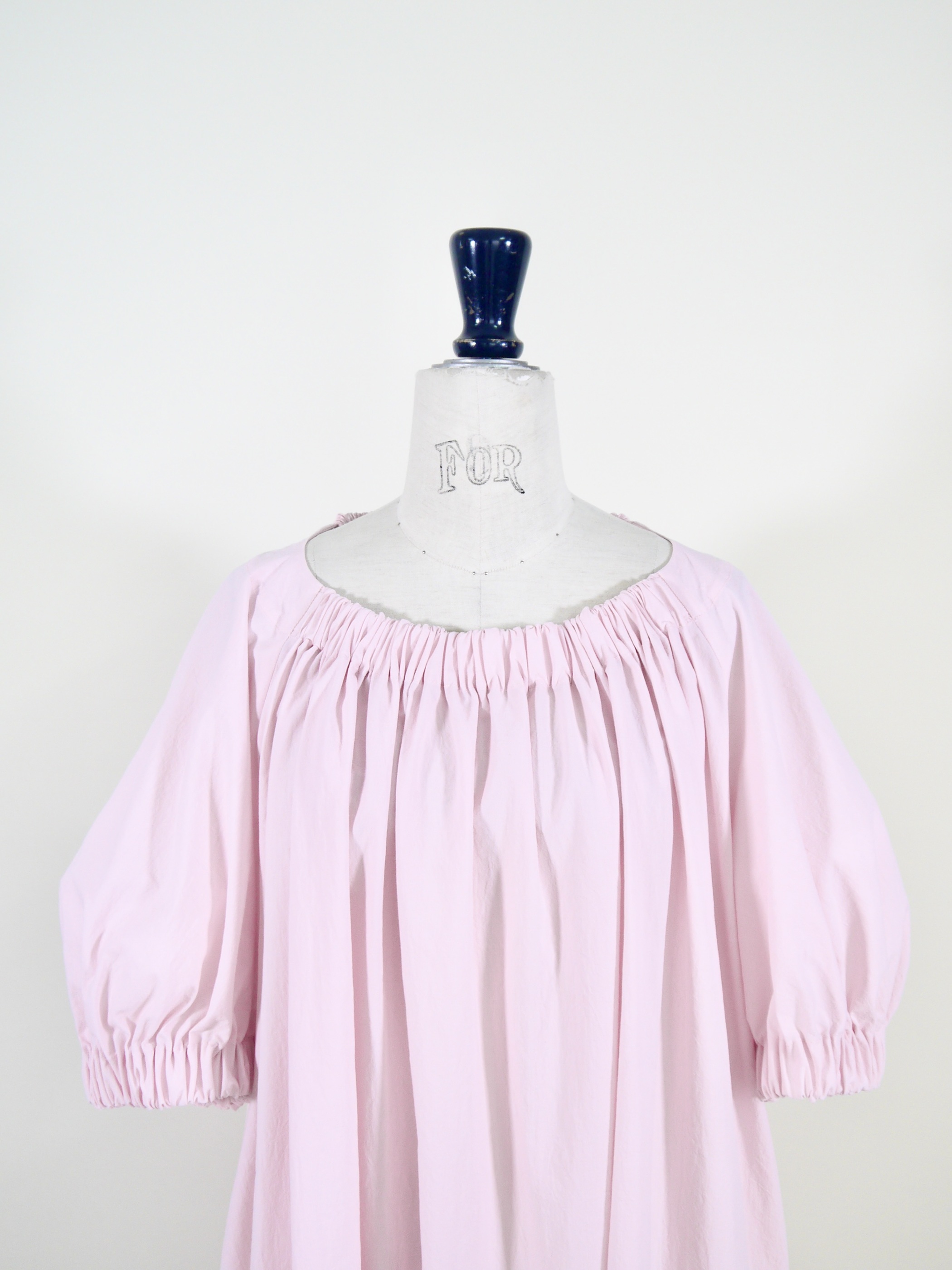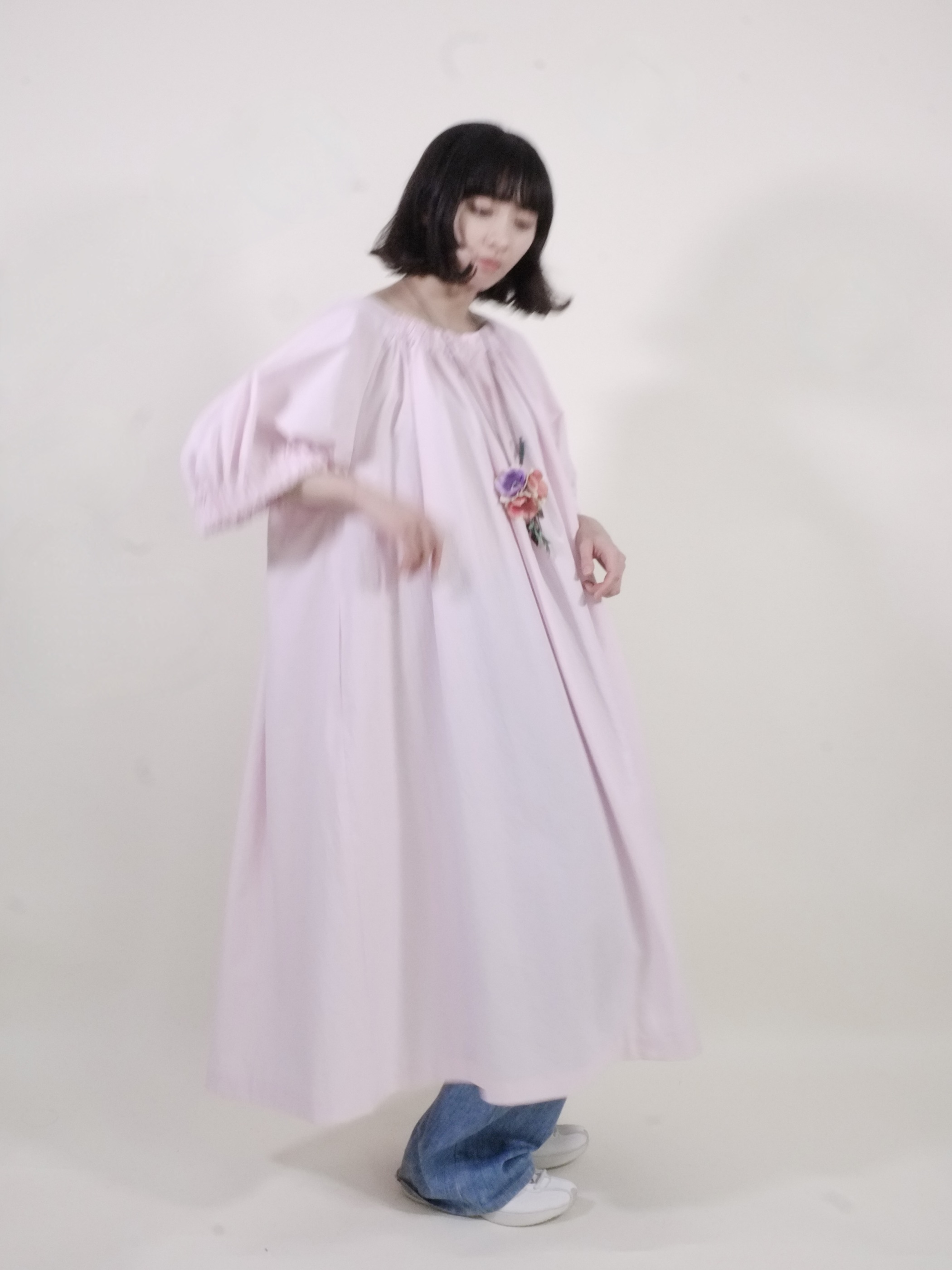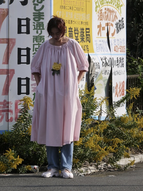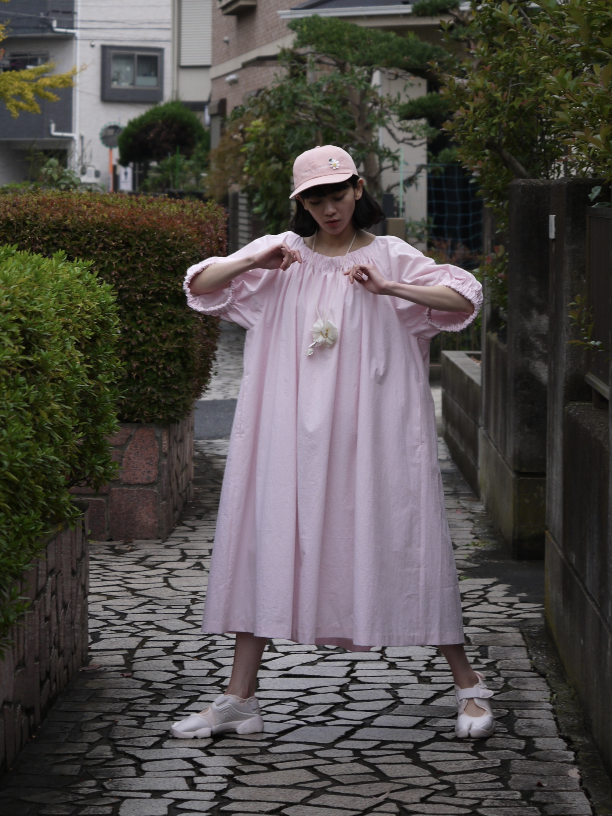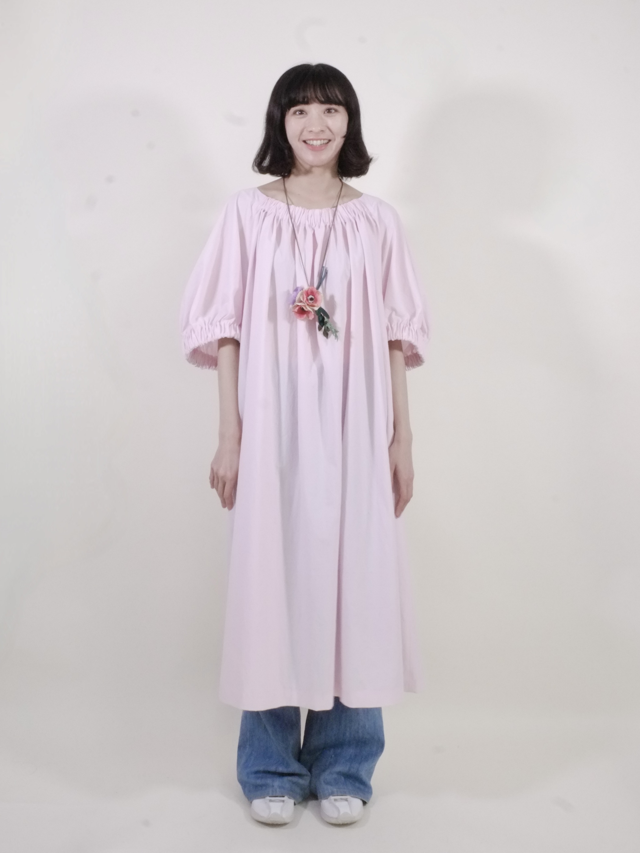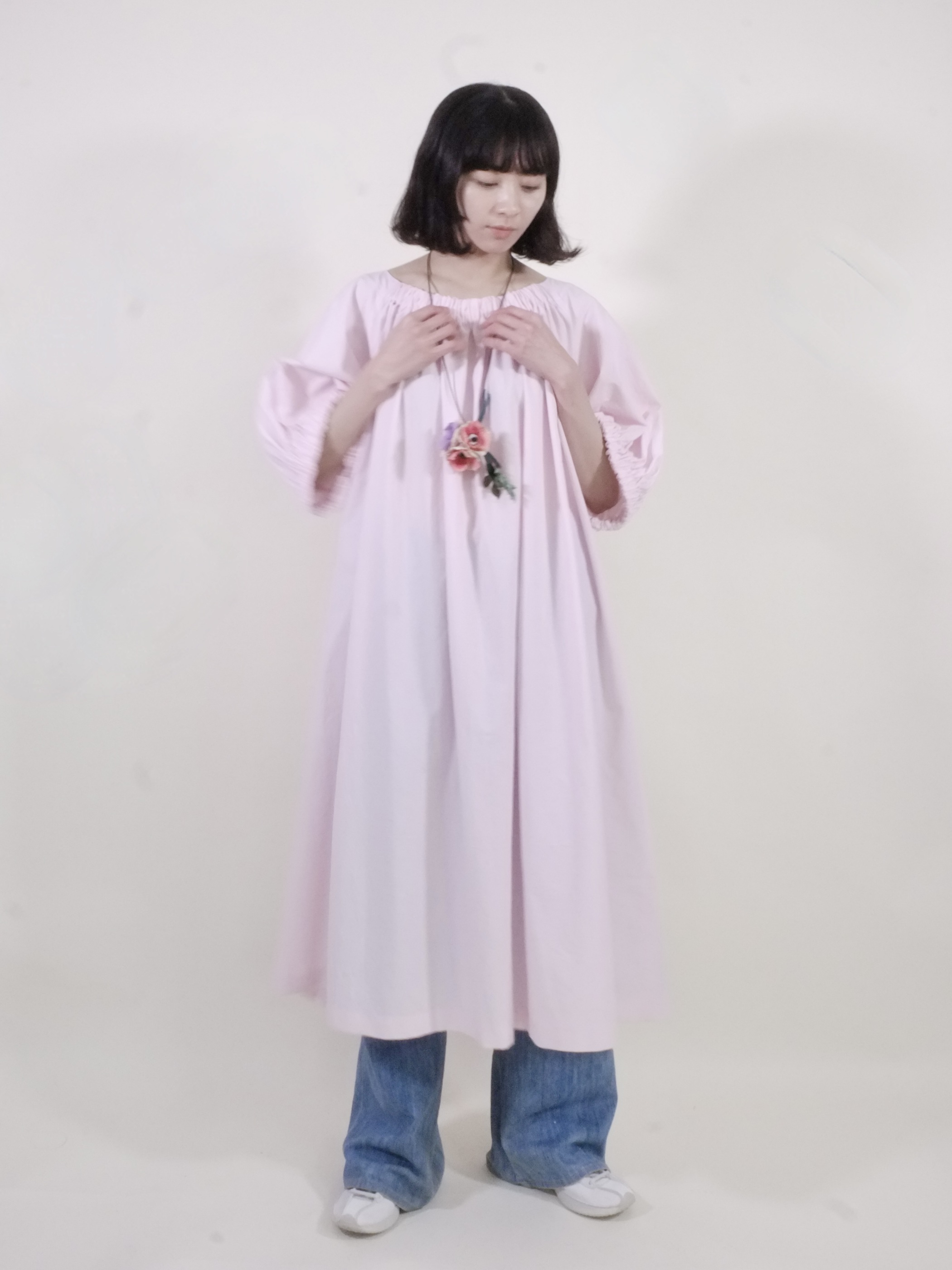 襟ぐりも袖口は広く大きく、裾の分量もあり、風通しのいいドレスです