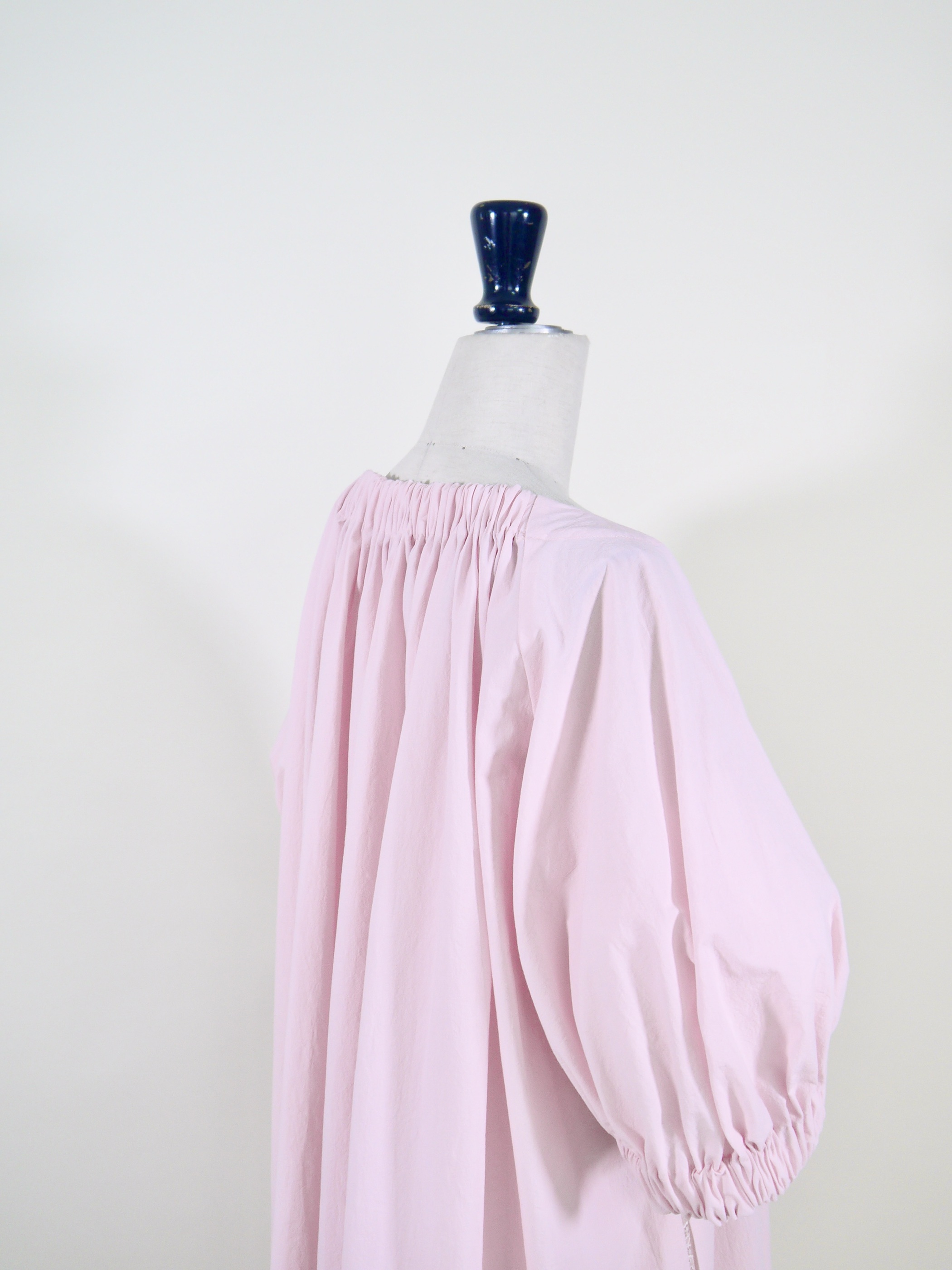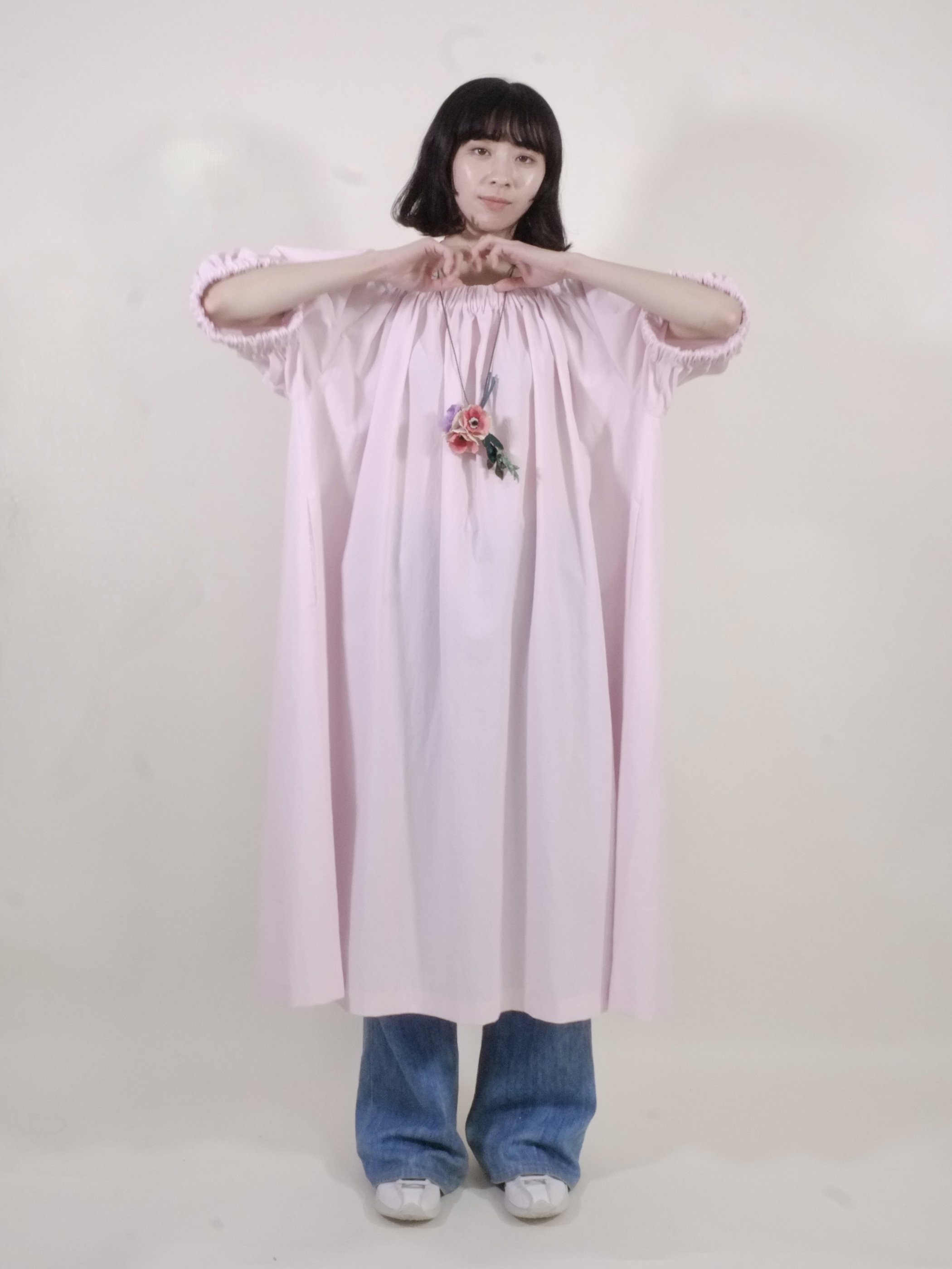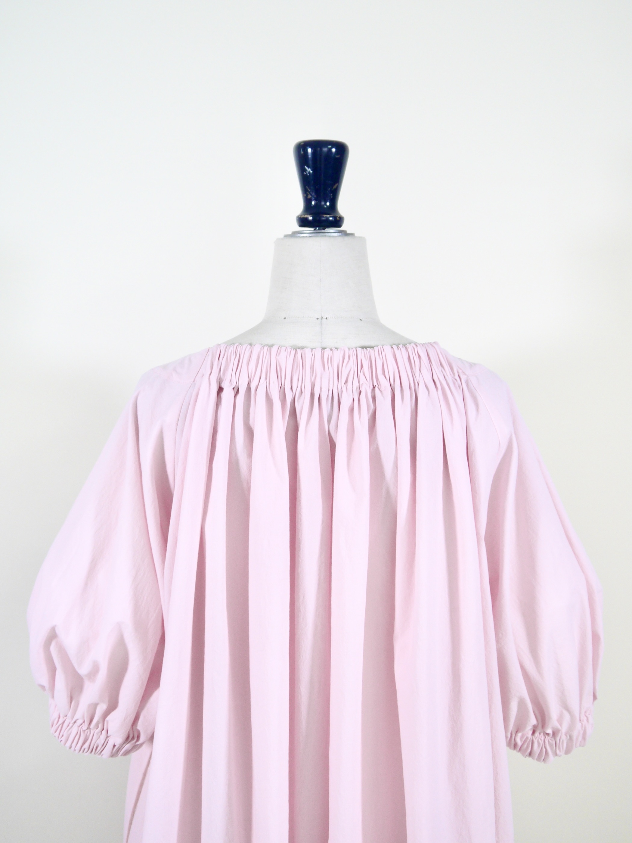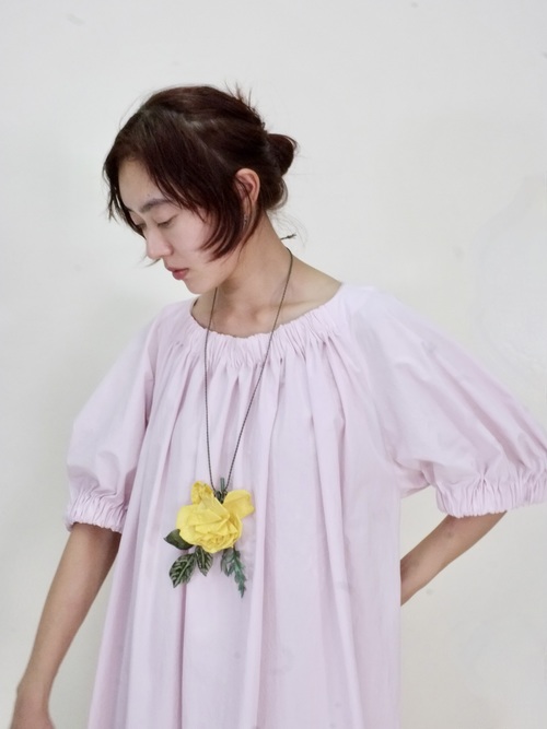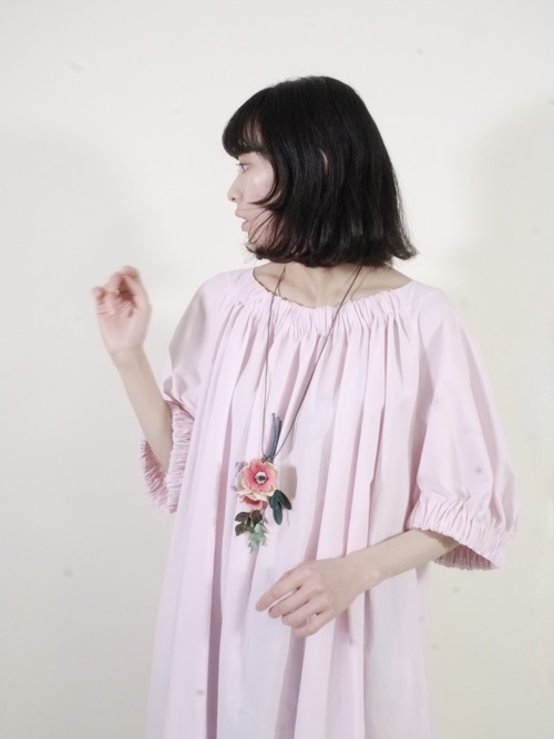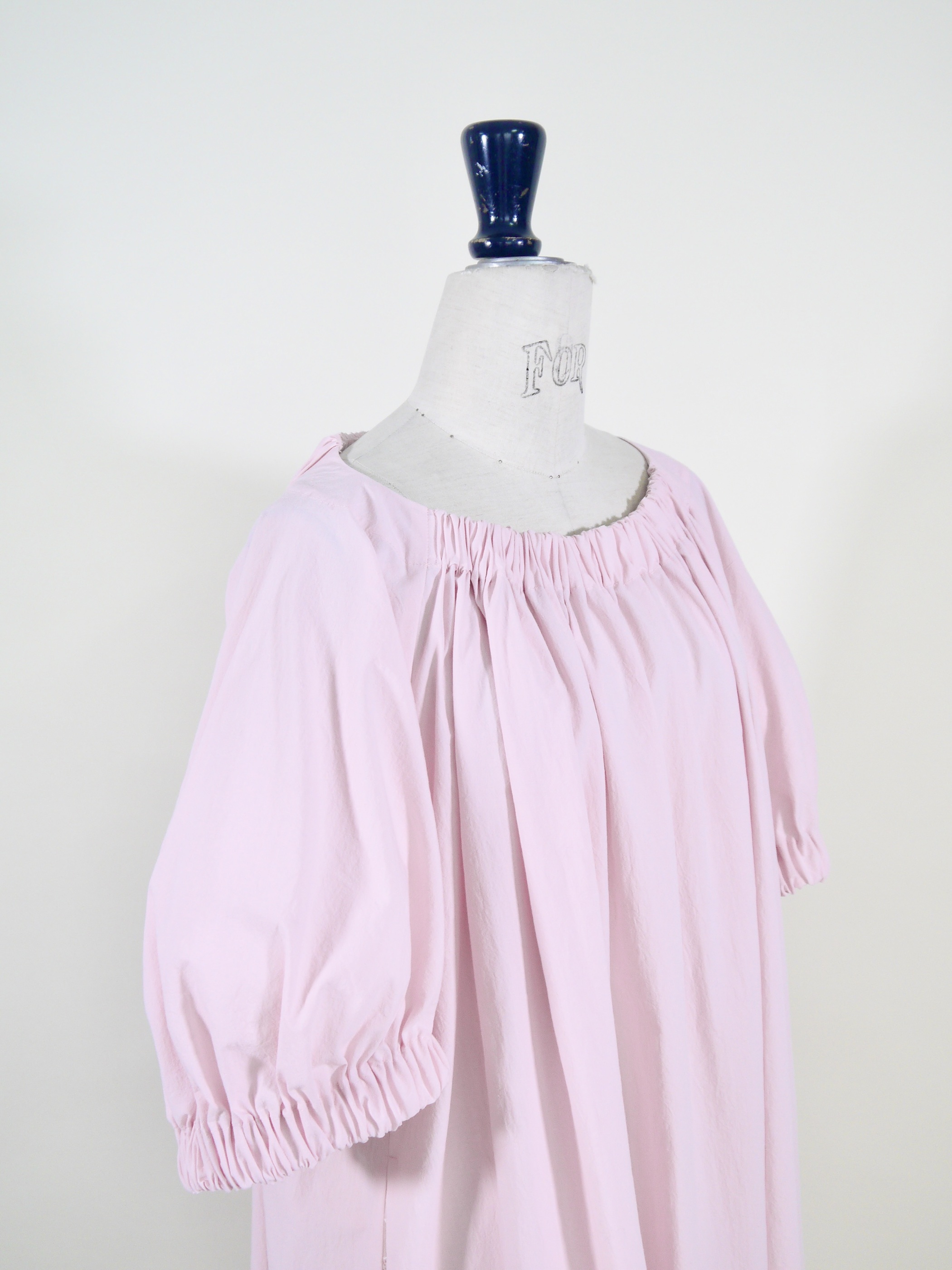 襟ぐりも袖口は広く大きく、裾の分量もあり、風通しのいいドレスです