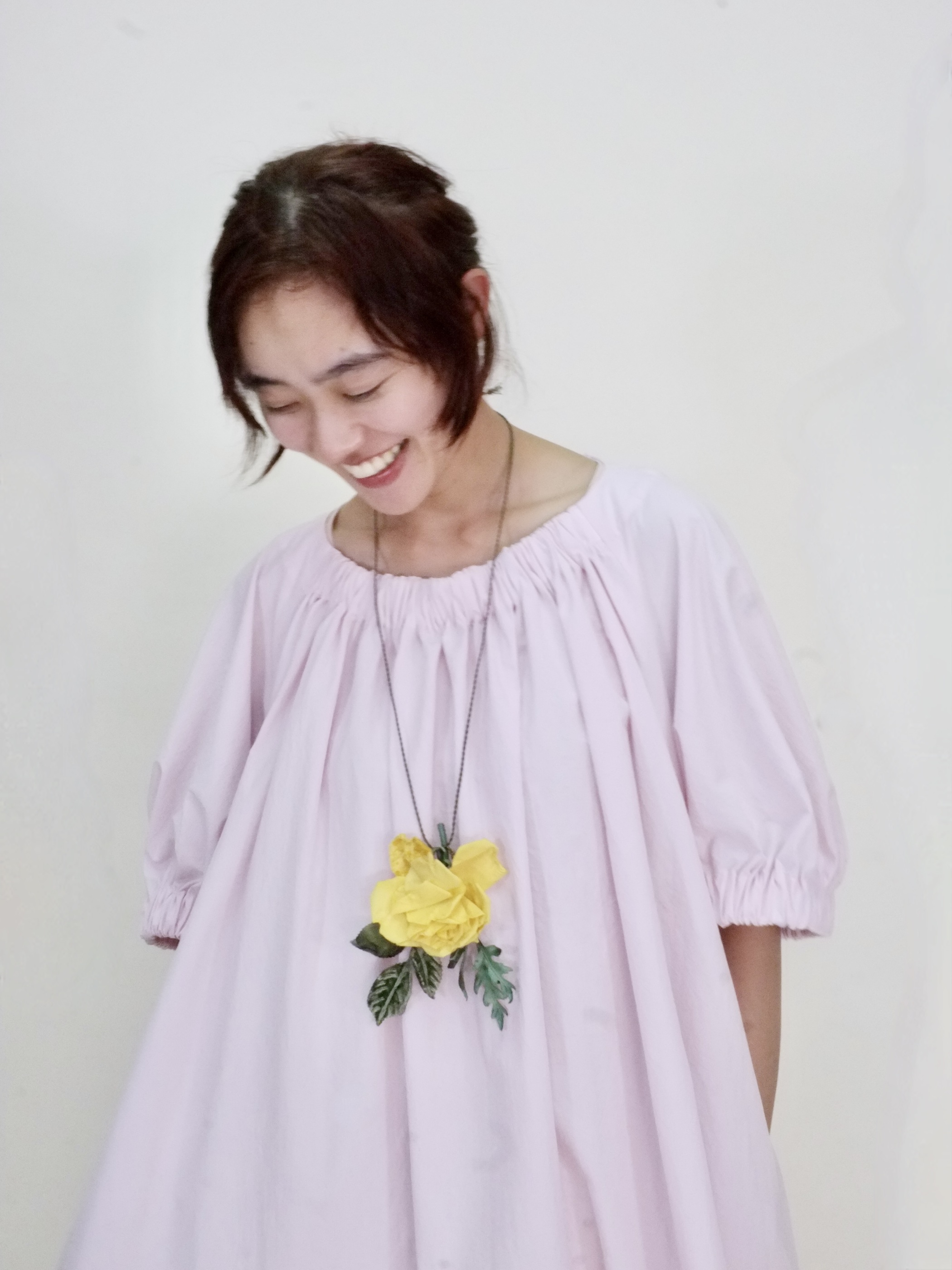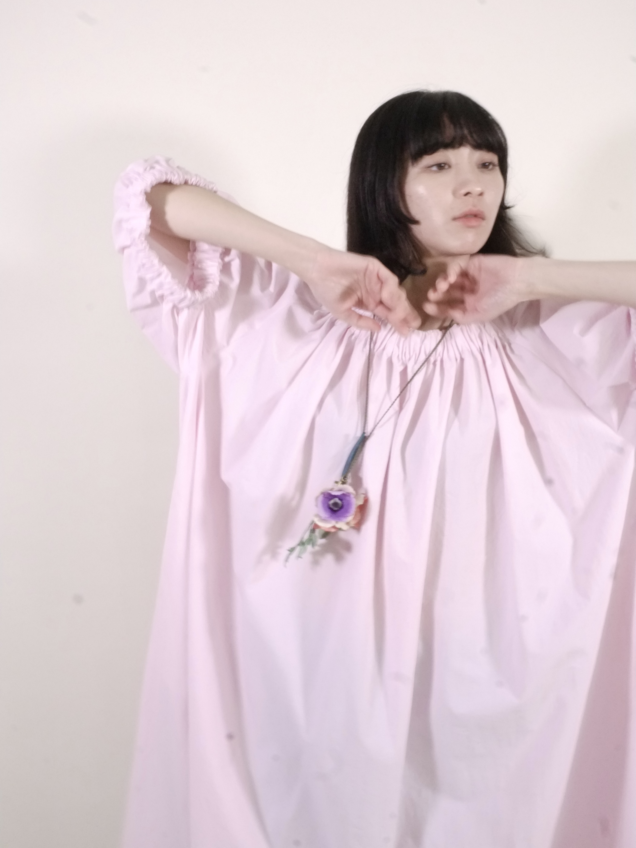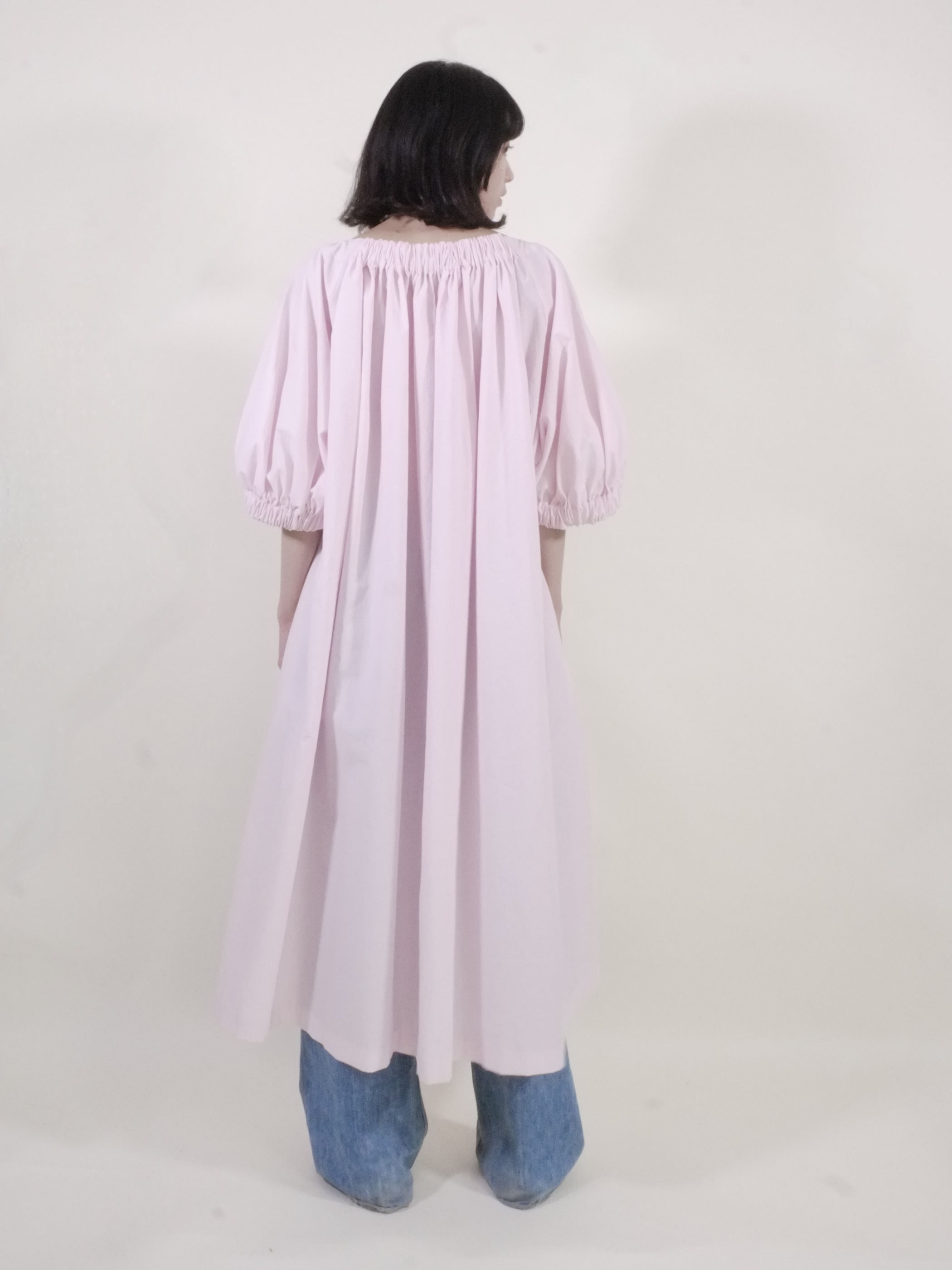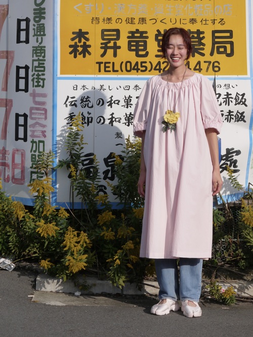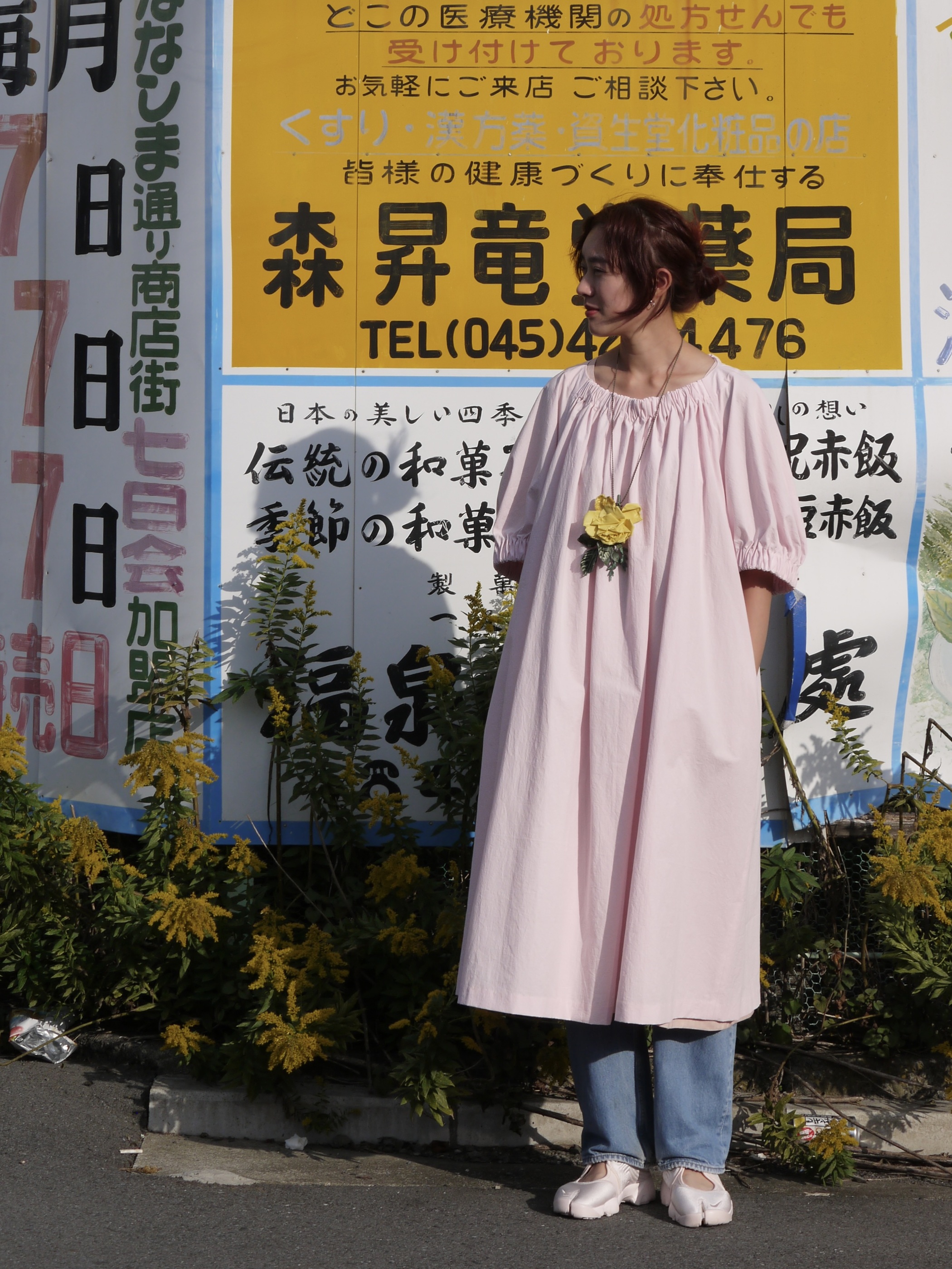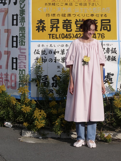 襟ぐりも袖口は広く大きく、裾の分量もあり、風通しのいいドレスです