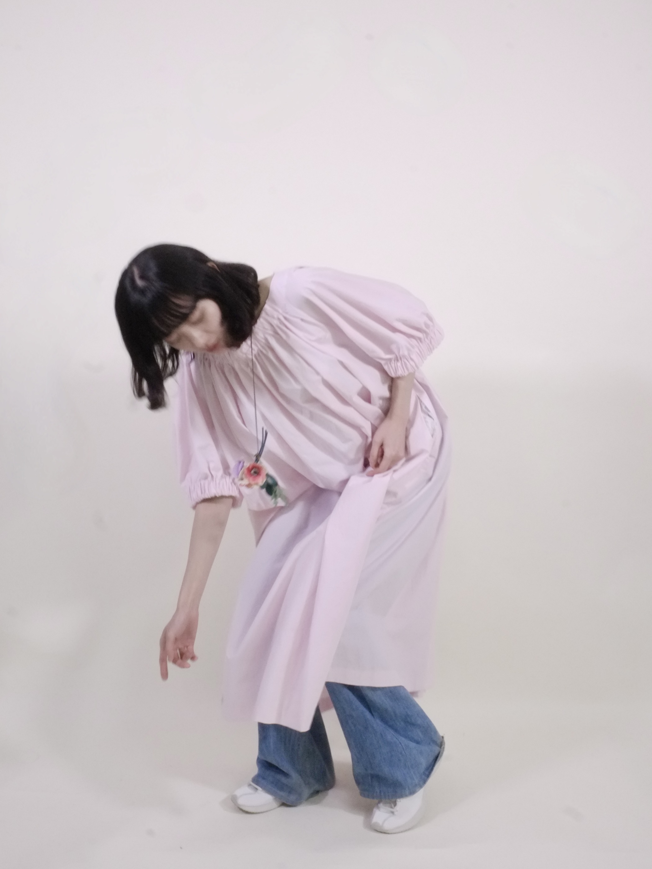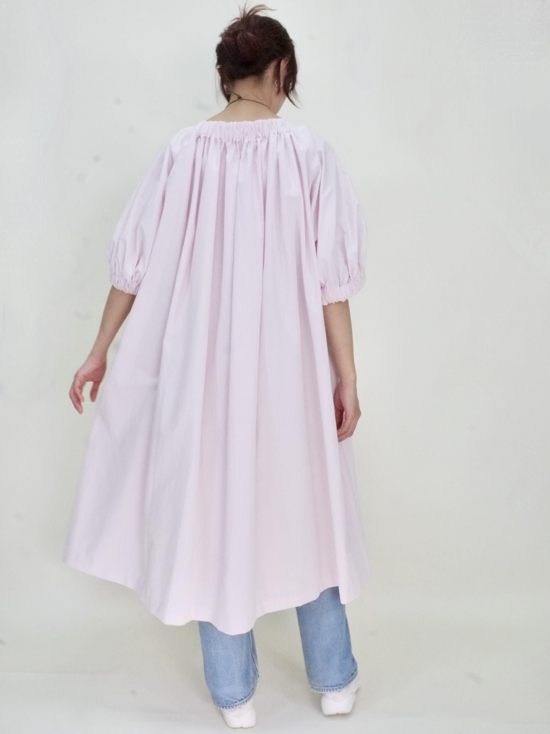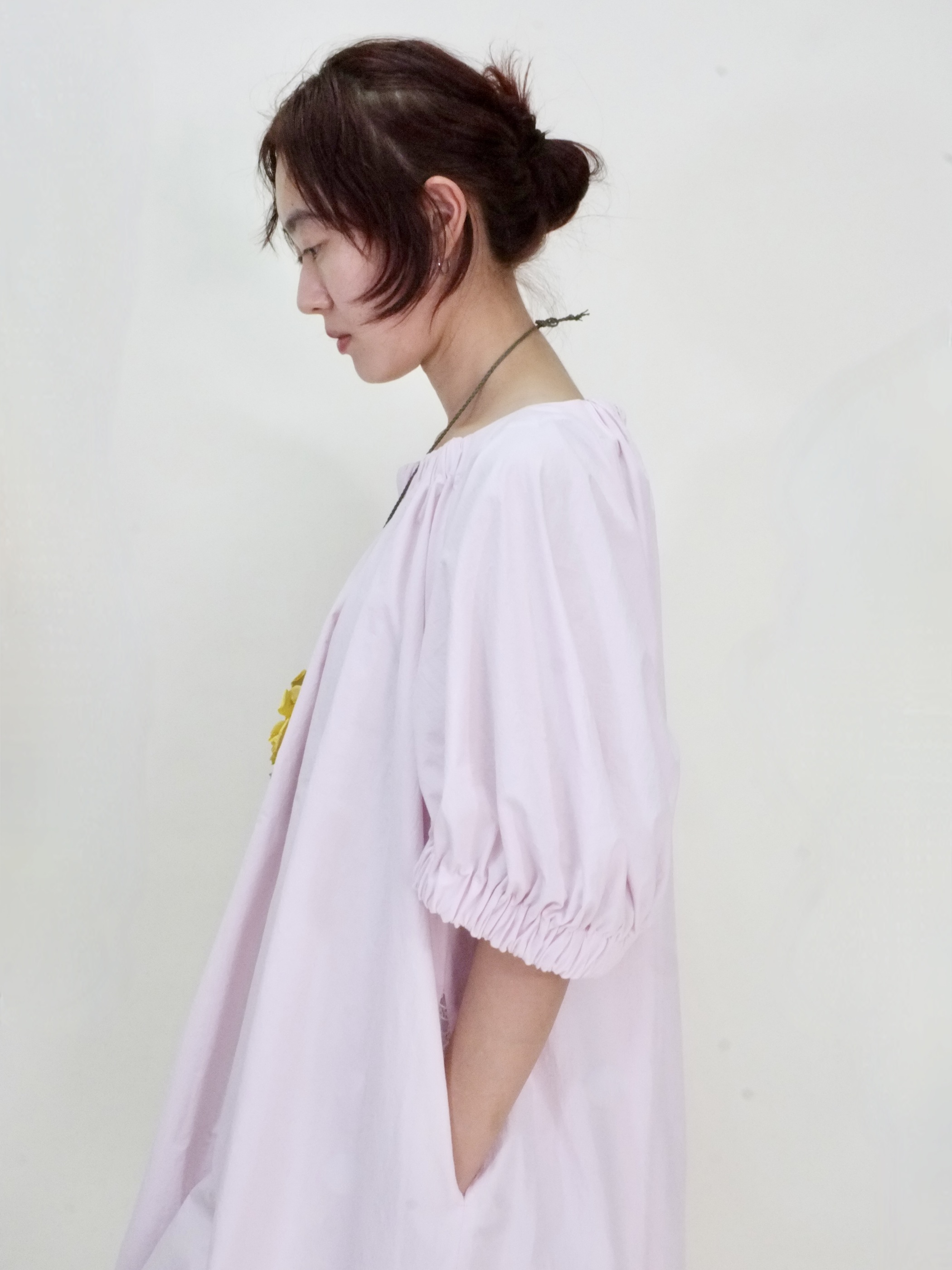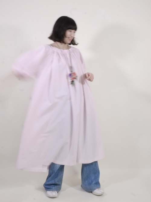 襟ぐりも袖口は広く大きく、裾の分量もあり、動きやすい風通しのいいドレスです