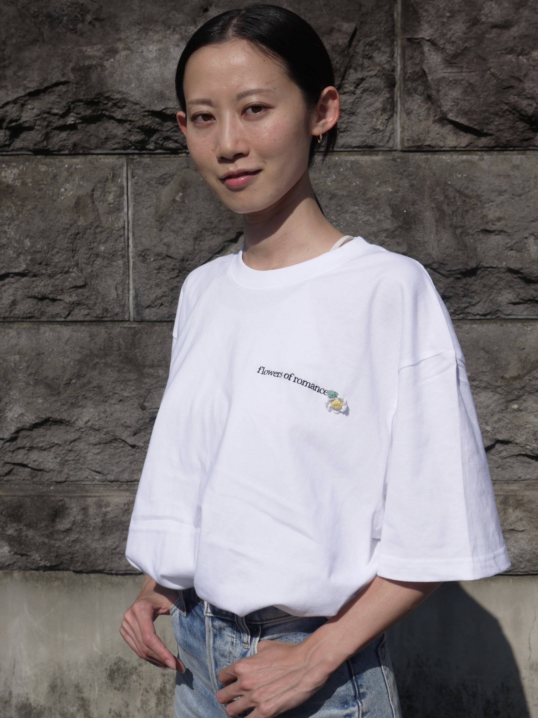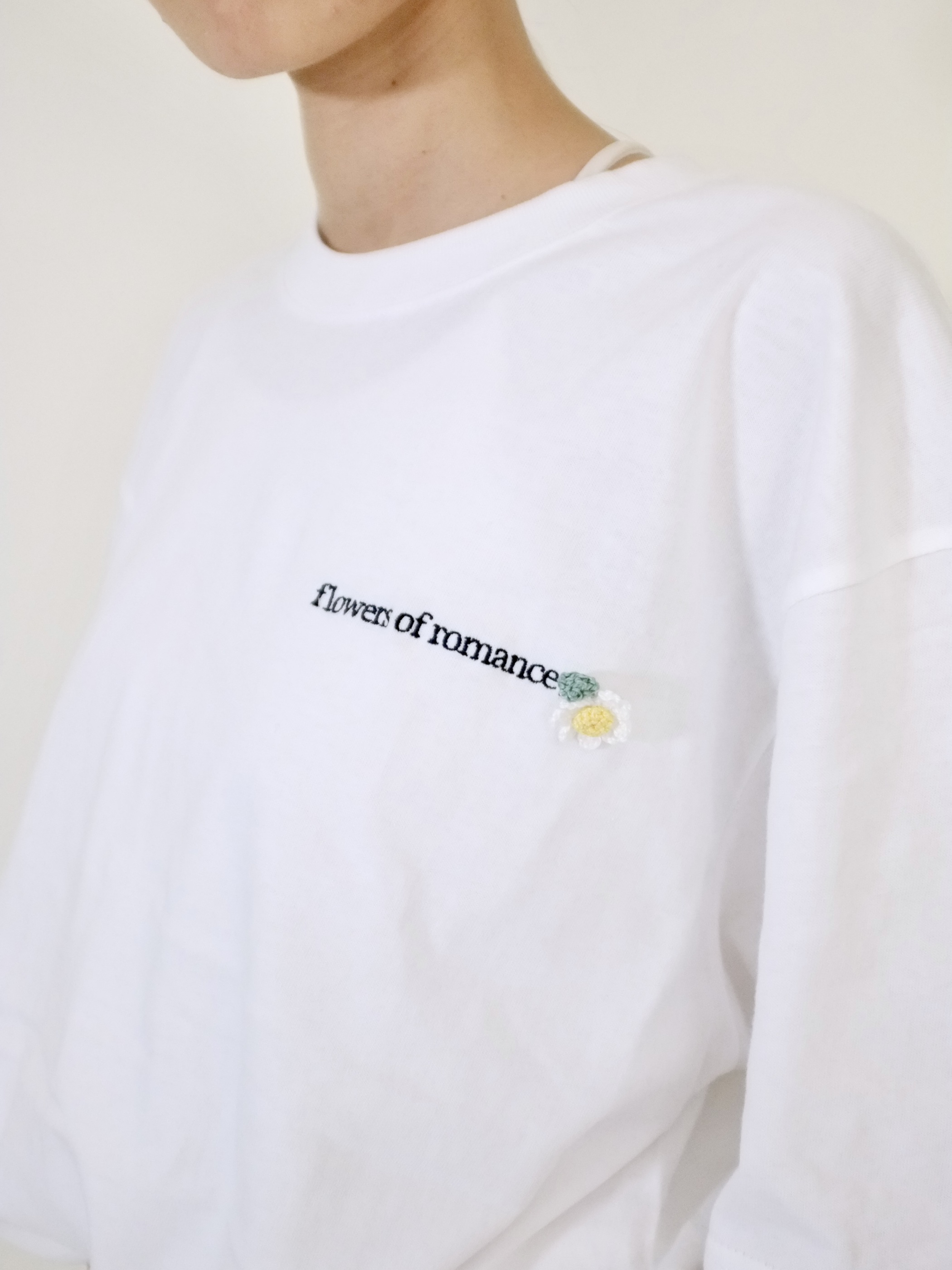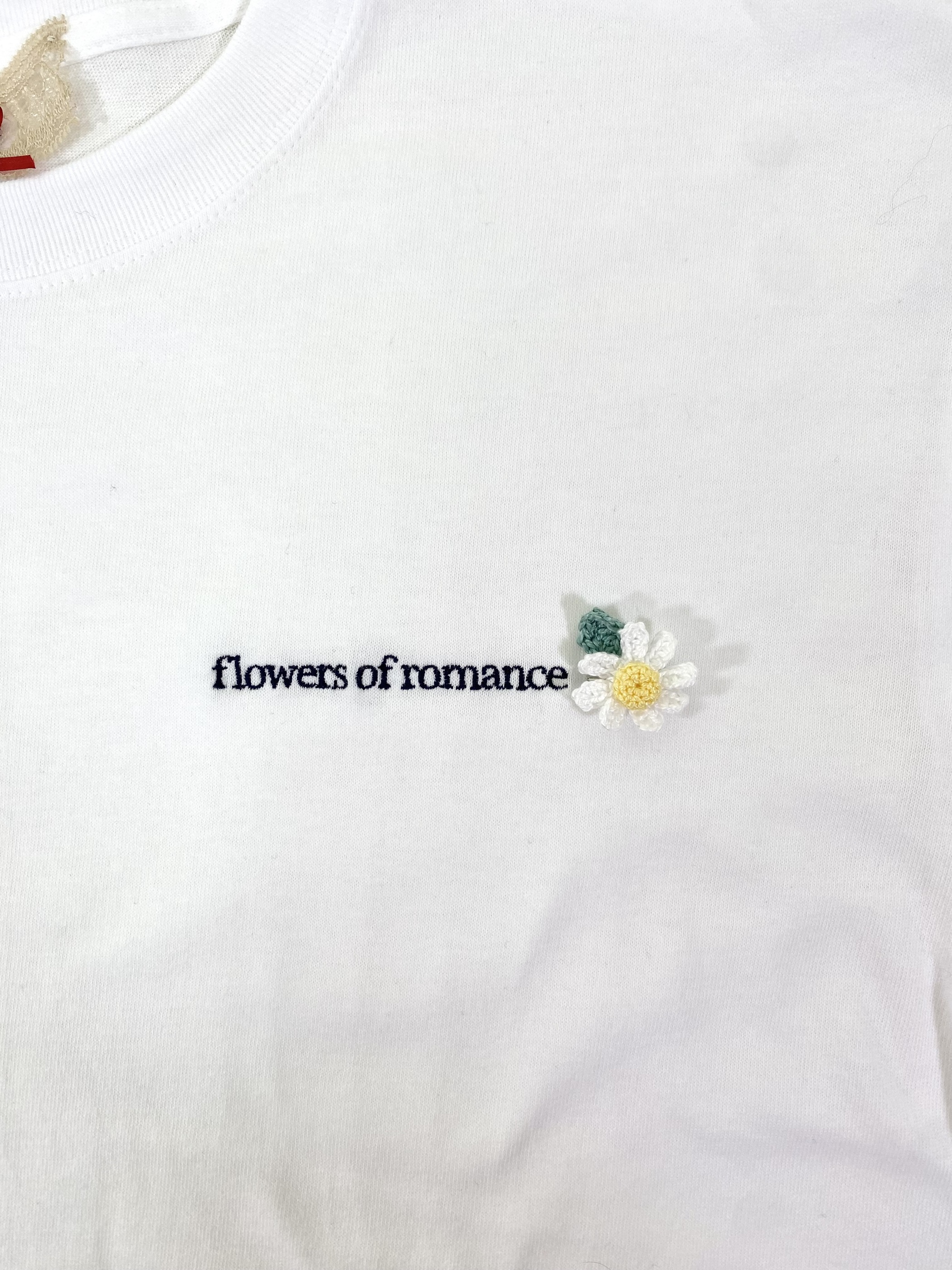 左胸に『flowers of romance』の刺繍。鉤針で編んだデイジーブローチは取り外し可能です。