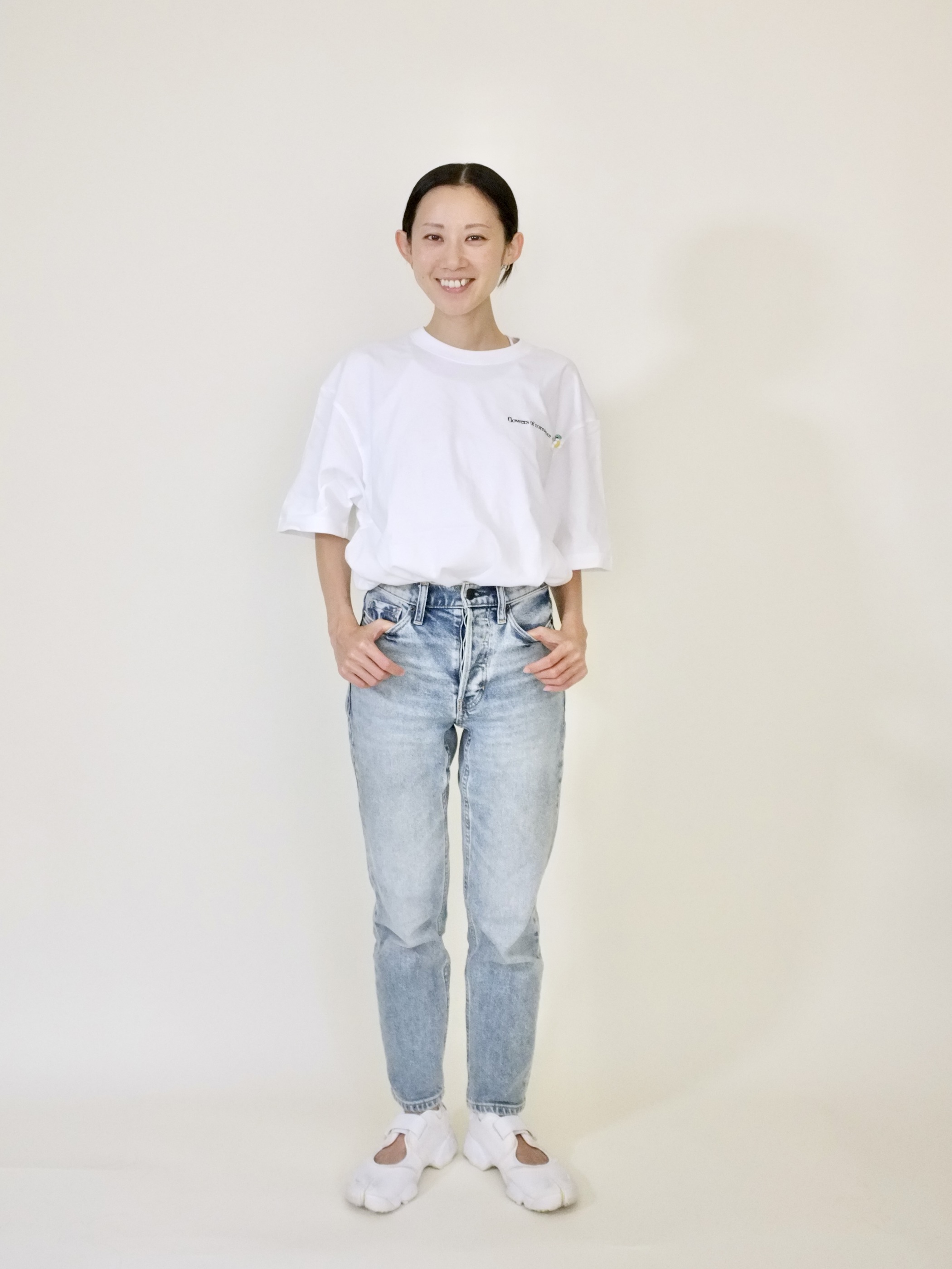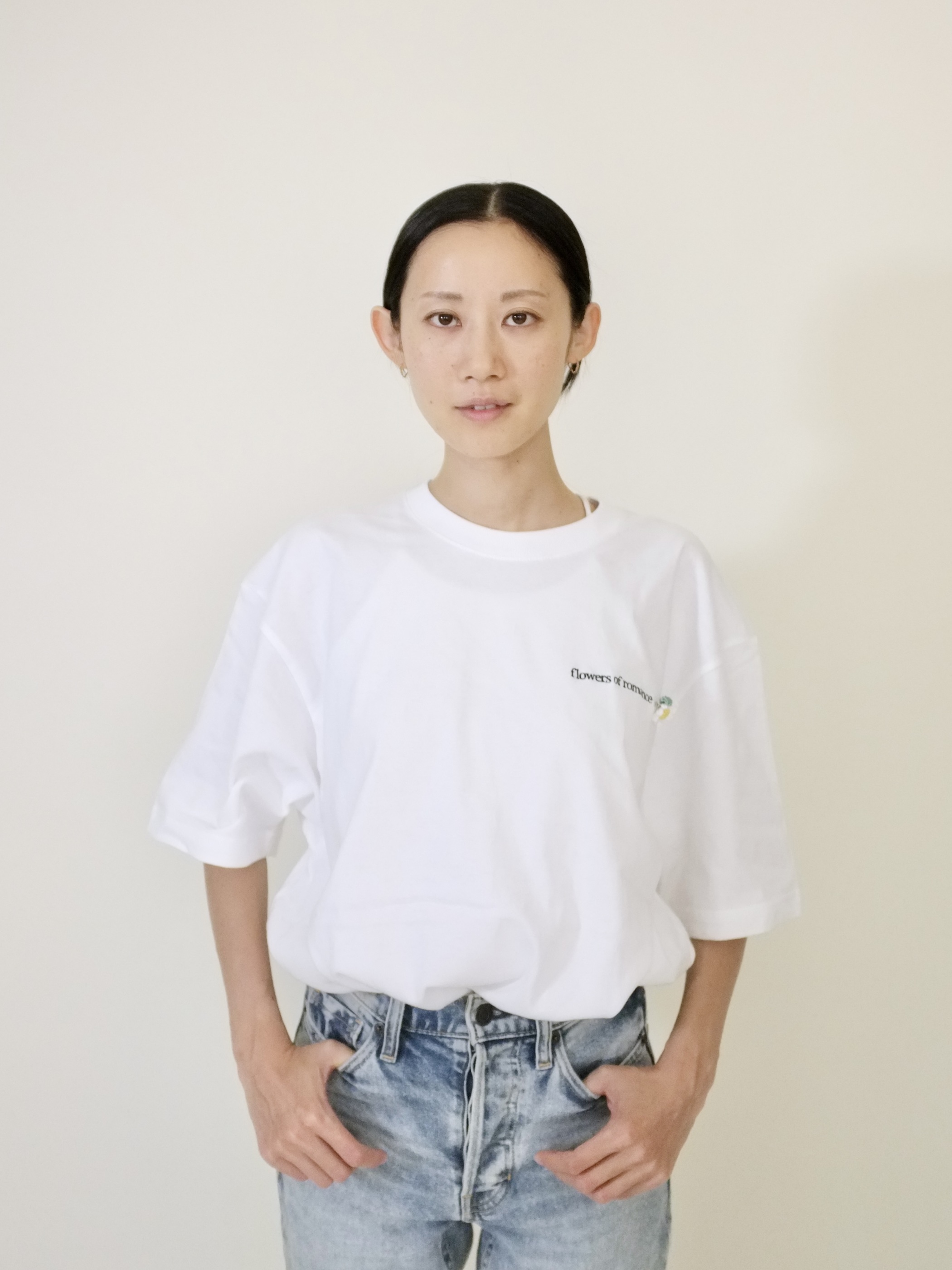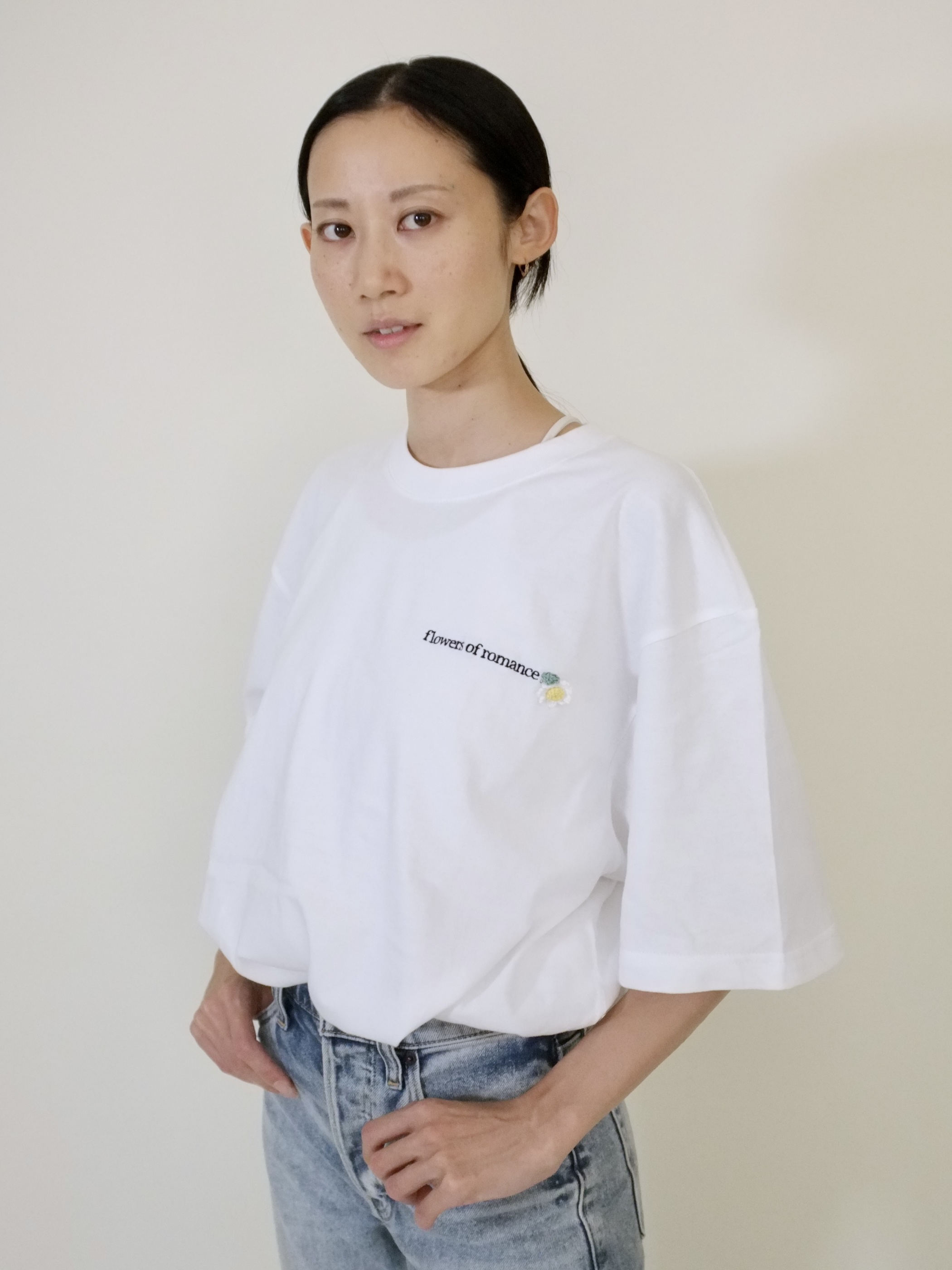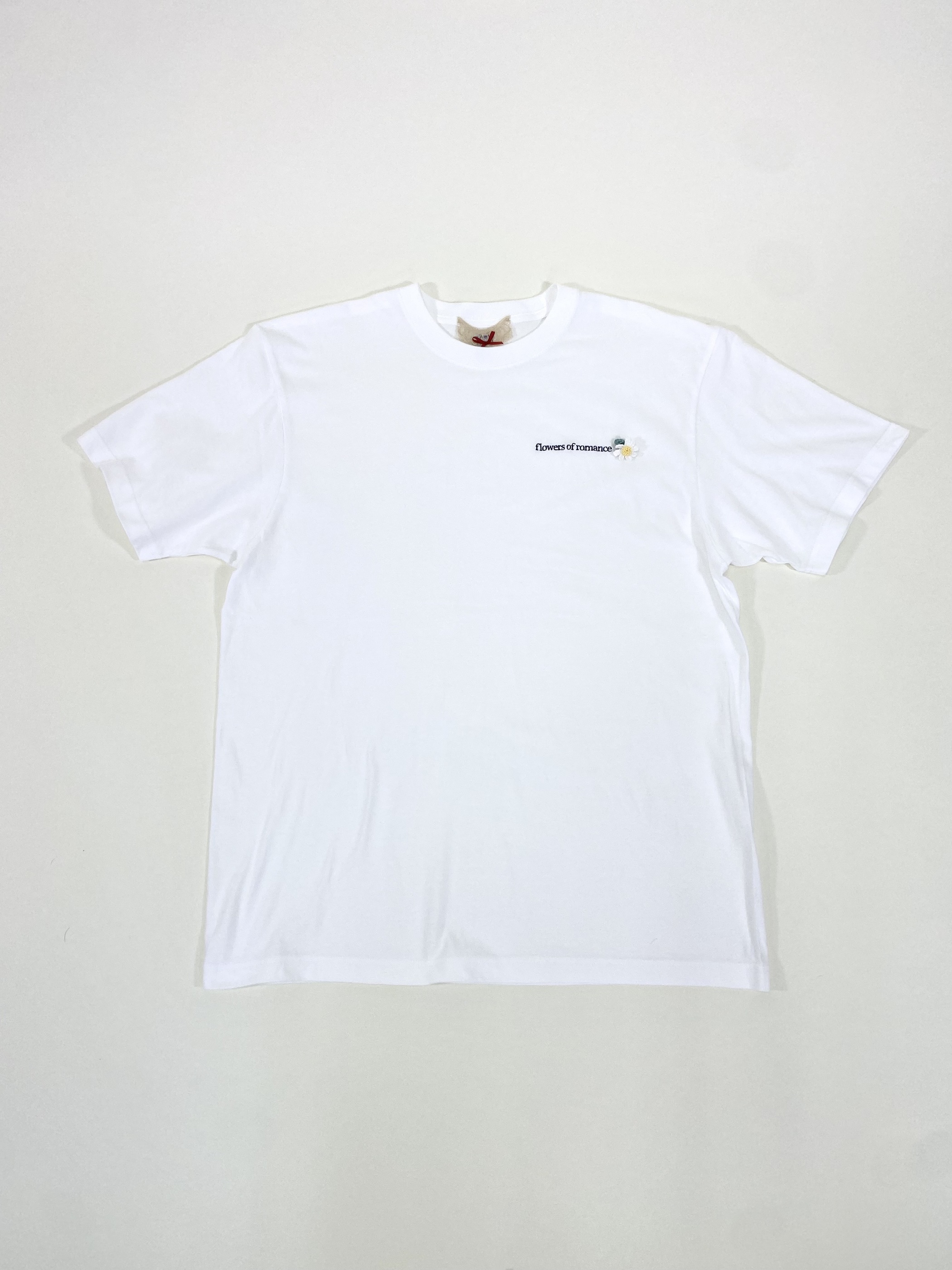 左胸に『flowers of romance』の刺繍。鉤針で編んだデイジーブローチは取り外し可能です。