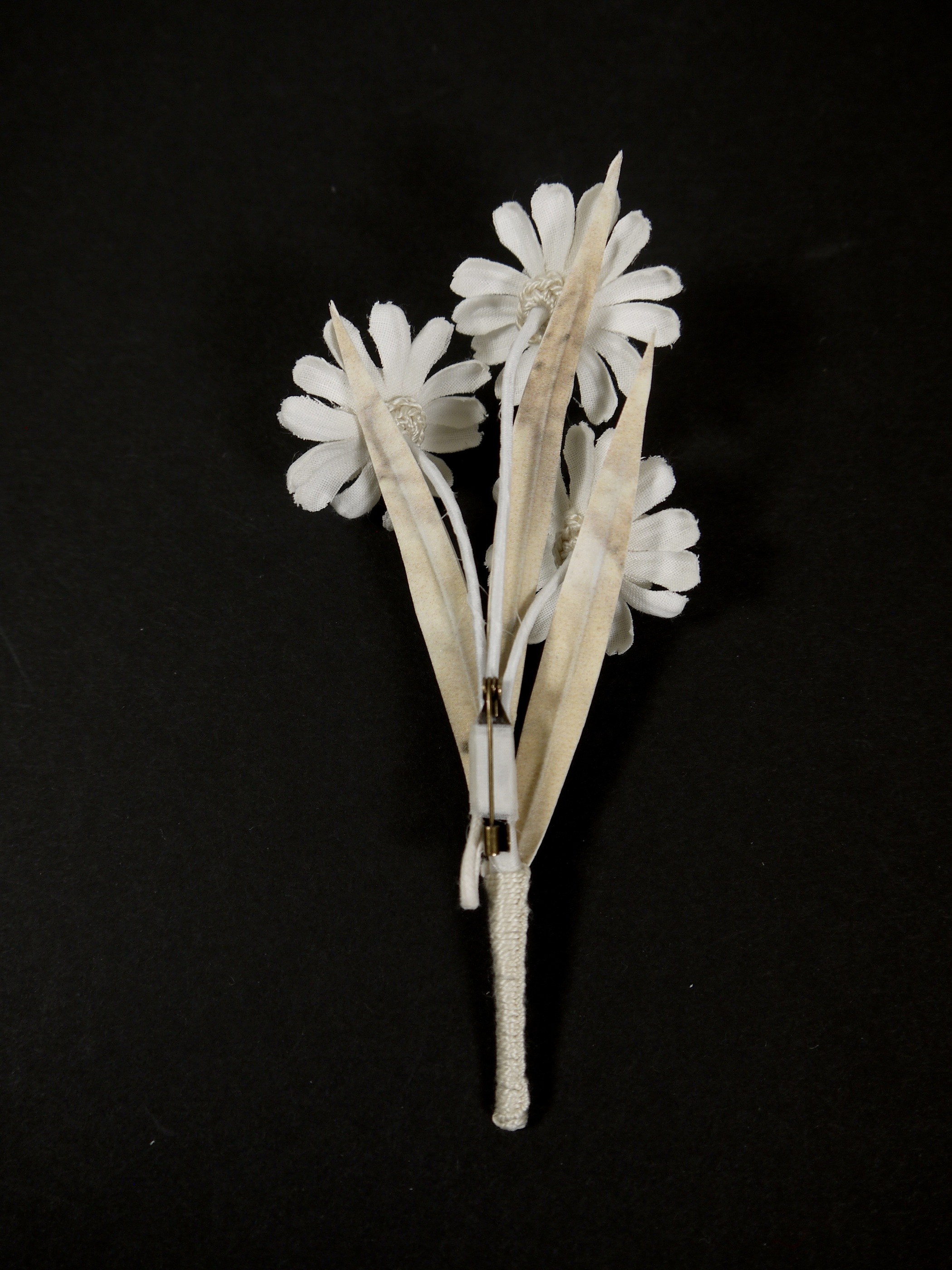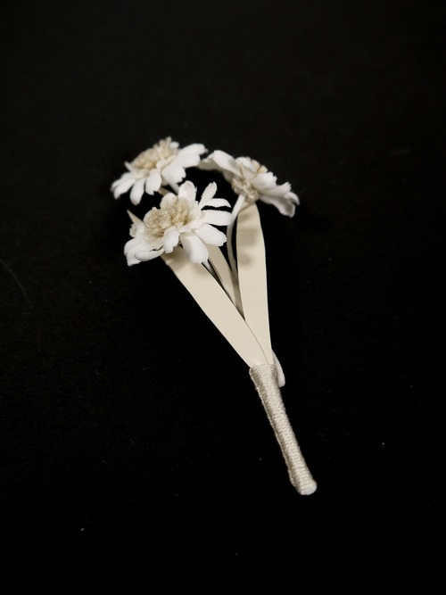 このコサージュは、白い布を一枚一枚手で染め、熱で花の形に加工したものです。そのため水に濡れると色落ちや型くずれの恐れがあります。雨の日のご使用や、白い服・薄い色の服とのコーディネイトはお避けください。また着用の際にはアクセサリーやバッグ、周囲の物との摩擦や引っ掛けに十分ご注意ください。一度型崩れをしますと修理等が不可能な場合があります。あらかじめ御了承ください。