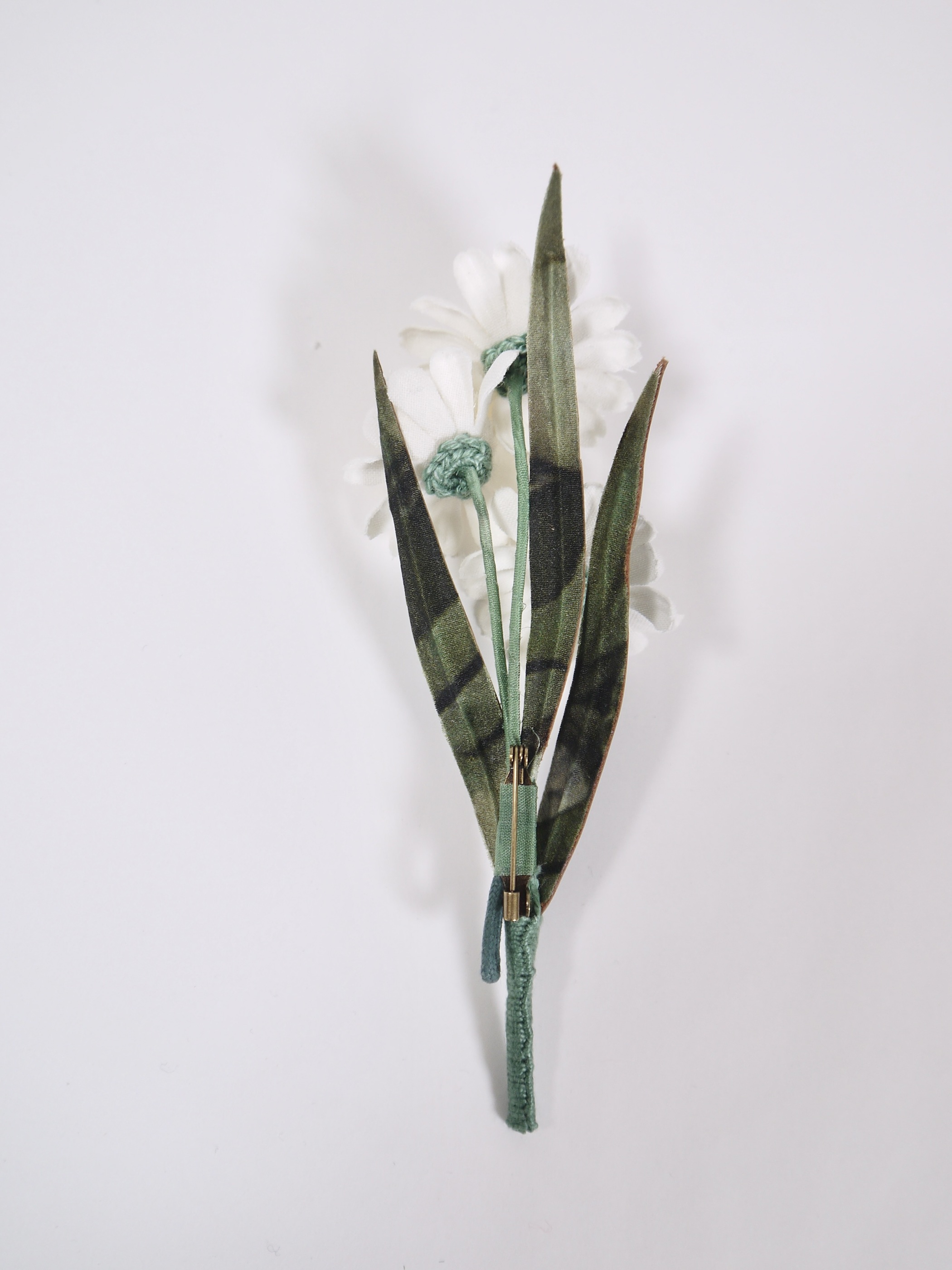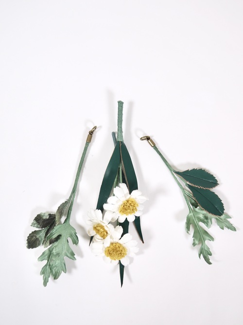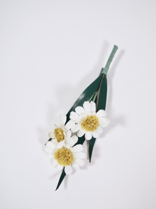フラットに組まれたデイジーブーケ本体に加え、質感の異なる2種類の葉のパーツがセットになっています。デイジー単体でシンプルに、または葉を組み合わせて立体的なブーケとしてお使いいただけます。