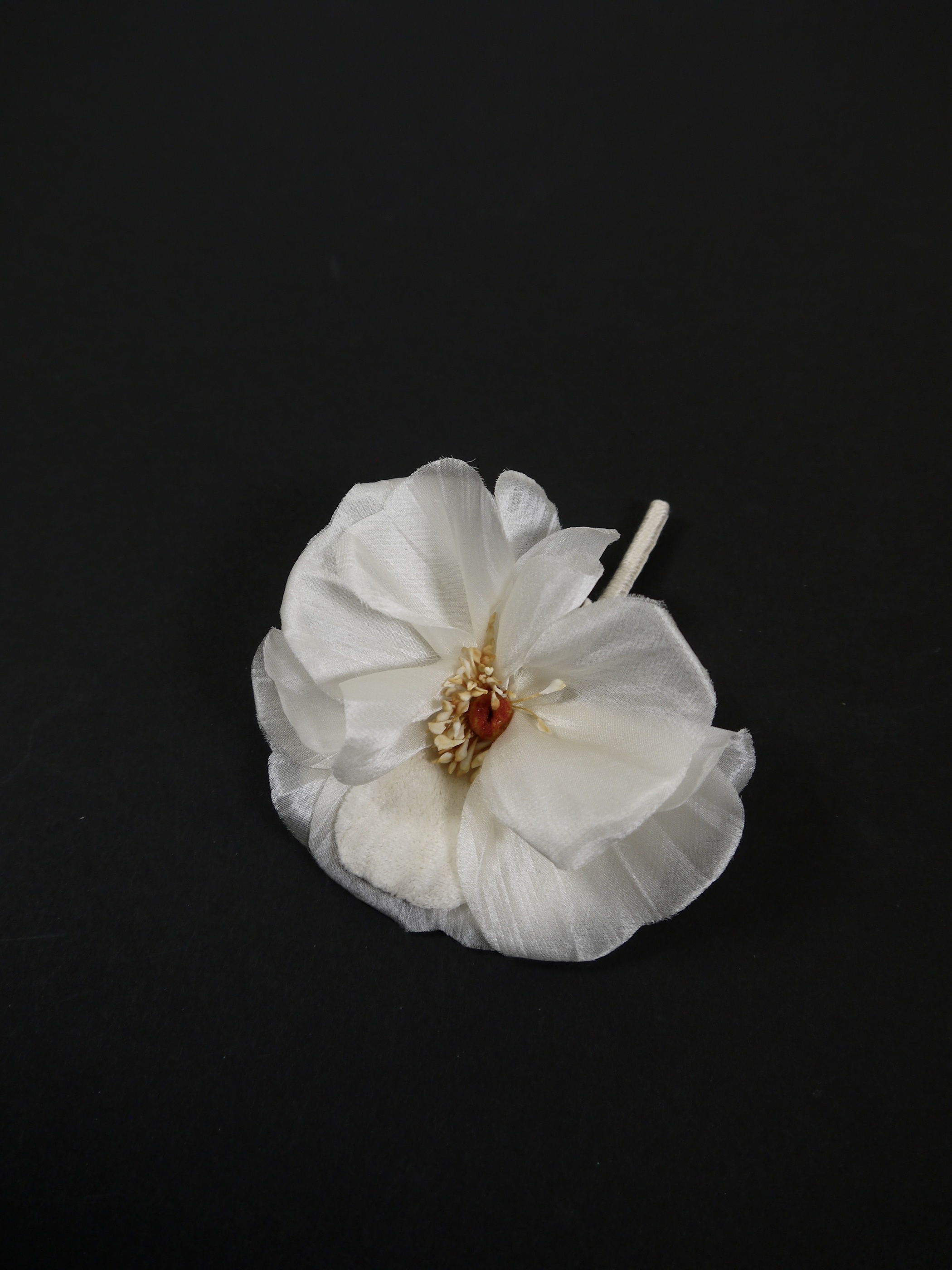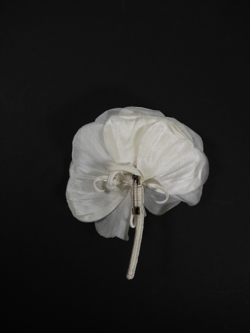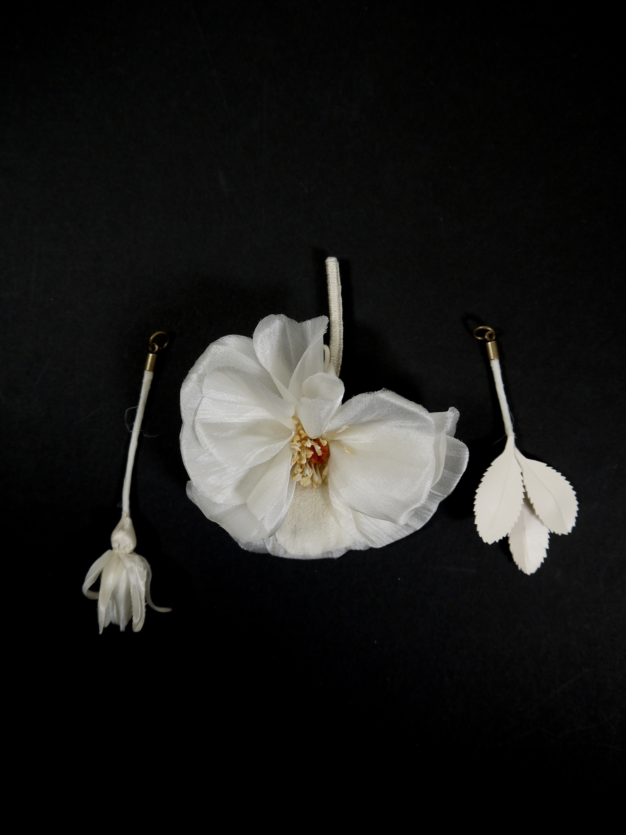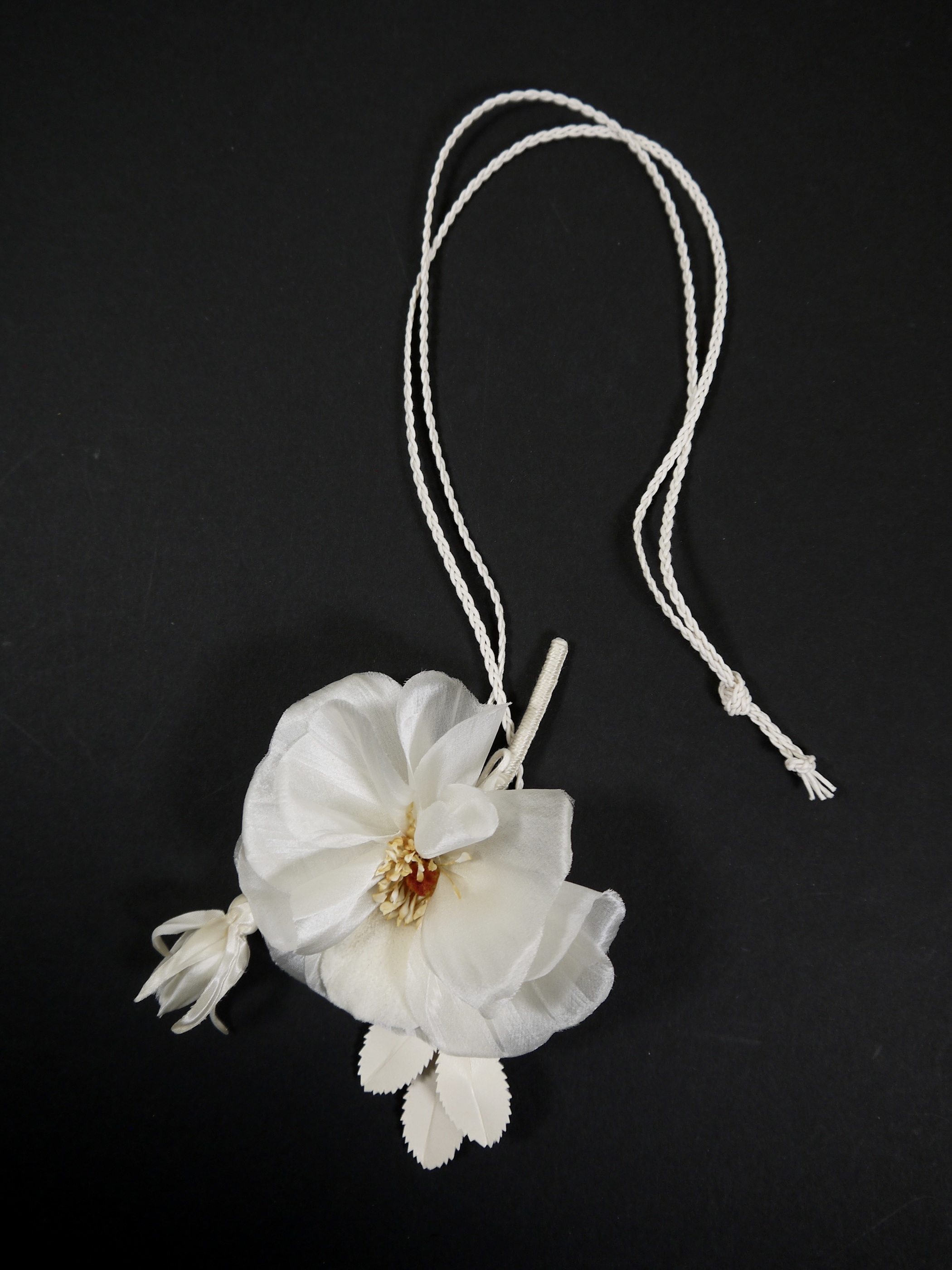 このコサージュは、白い布を一枚一枚手で染め、熱で花の形に加工したものです。そのため水に濡れると色落ちや型くずれの恐れがあります。雨の日のご使用や、白い服・薄い色の服とのコーディネイトはお避けください。また着用の際にはアクセサリーやバッグ、周囲の物との摩擦や引っ掛けに十分ご注意ください。一度型崩れをしますと修理等が不可能な場合があります。あらかじめ御了承ください。