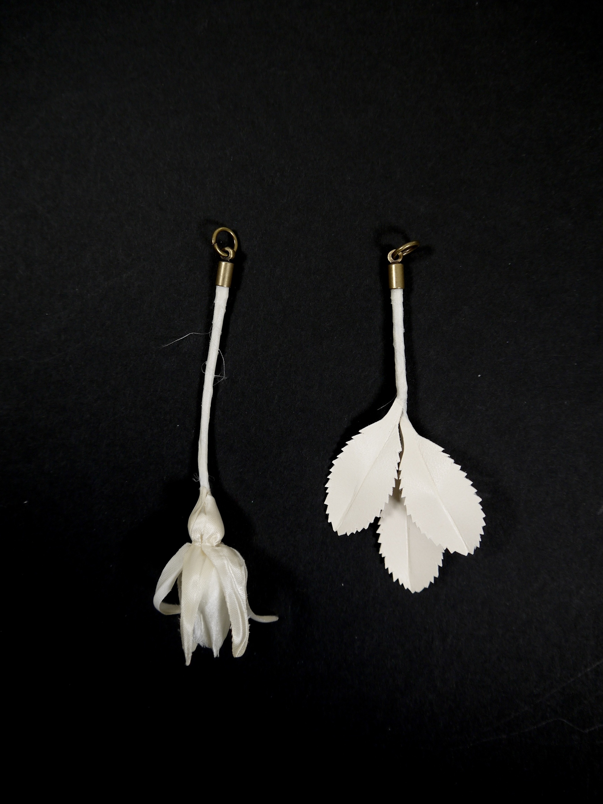 ブローチとして単体で、または付属のコードを通すことで、野薔薇、葉のパーツ、つぼみを組み合わせたペンダントとしてご使用いただけます。