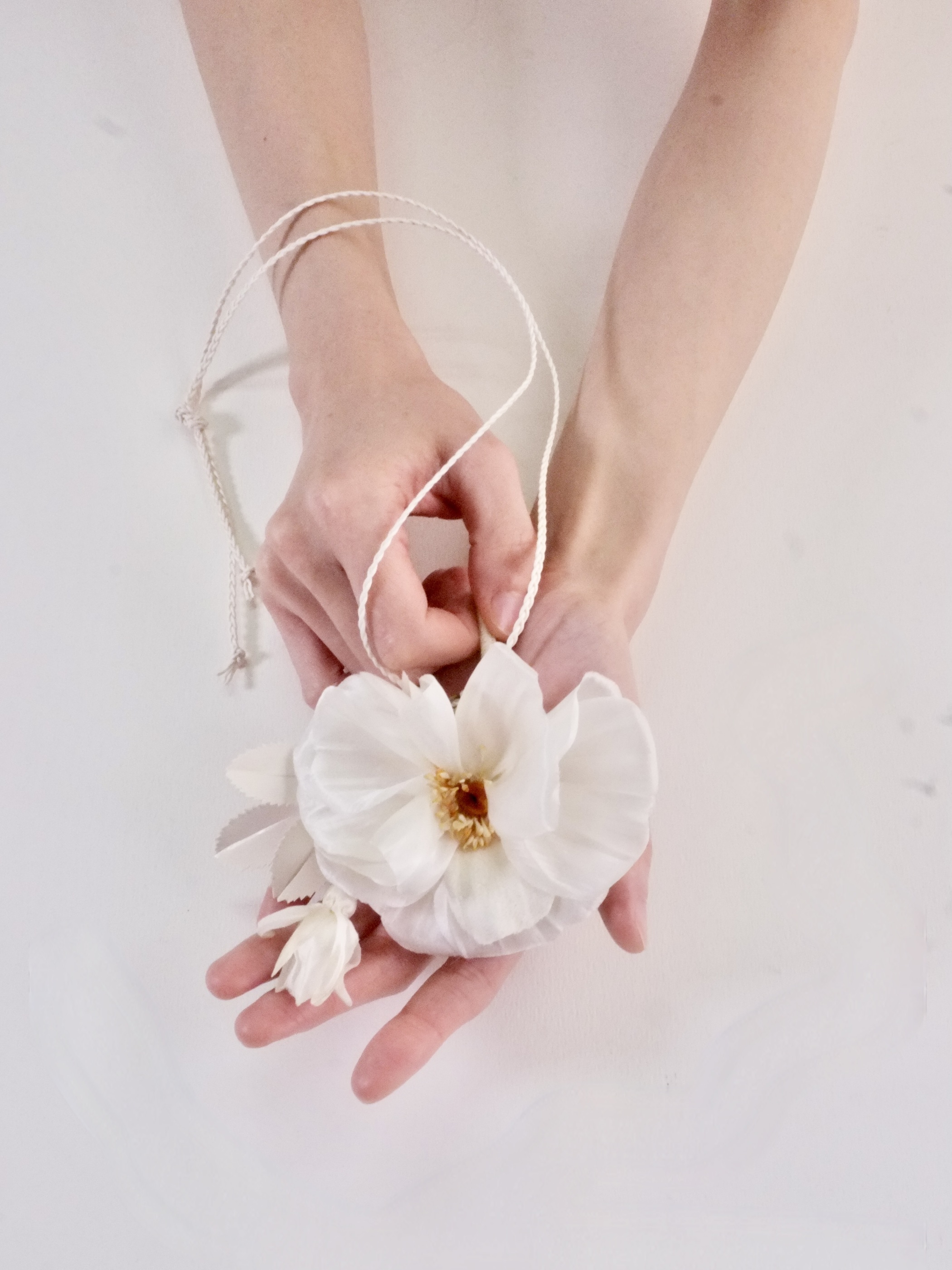 この野薔薇のペンダントコサージュは、私にとっての薔薇にまつわる沢山の思い出、そして友人から贈られた一つの深い哲学から生まれました。